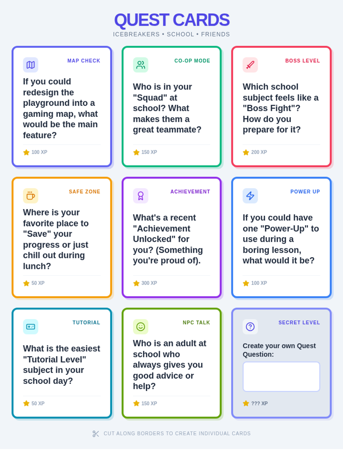 A set of gaming-themed icebreaker cards for Year 5 students, featuring vibrant colors, game icons, and questions about school and friends framed as "quests" and "achievements."