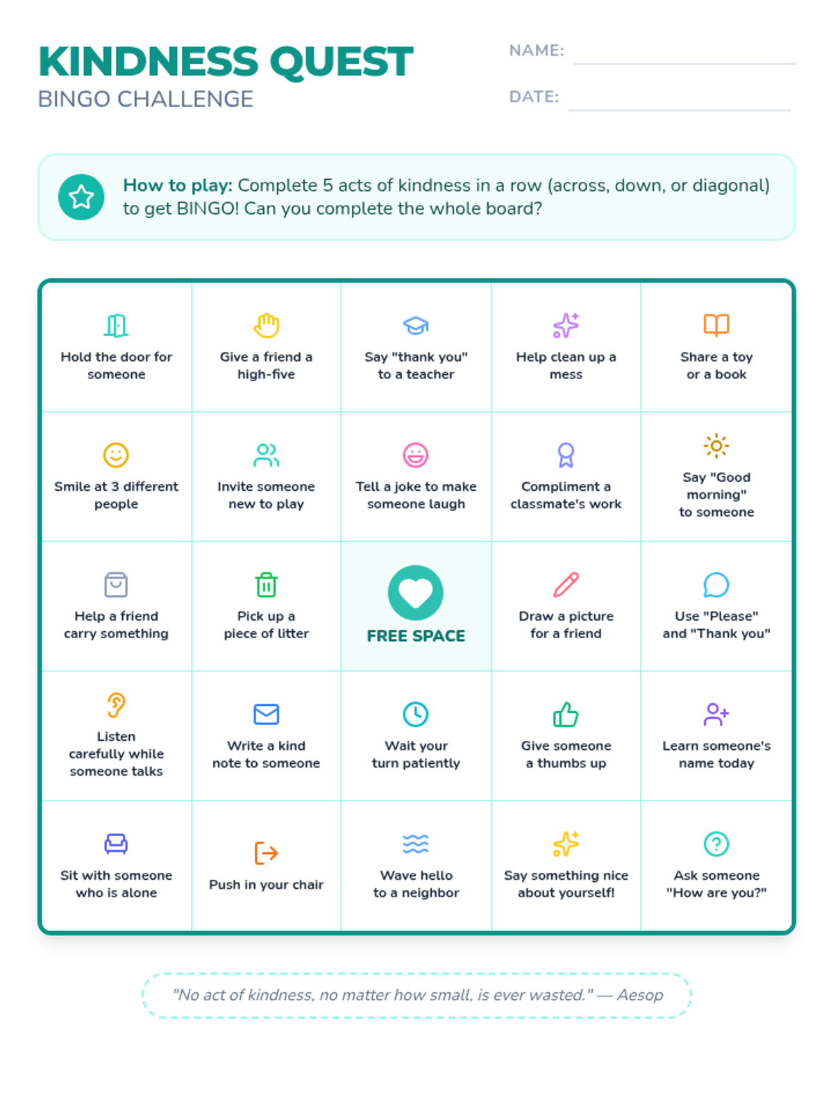 A colorful 5x5 kindness bingo card designed for PK-5 students, featuring 24 actionable acts of kindness and a central free space. It includes engaging icons and clear instructions to encourage positive social interactions.