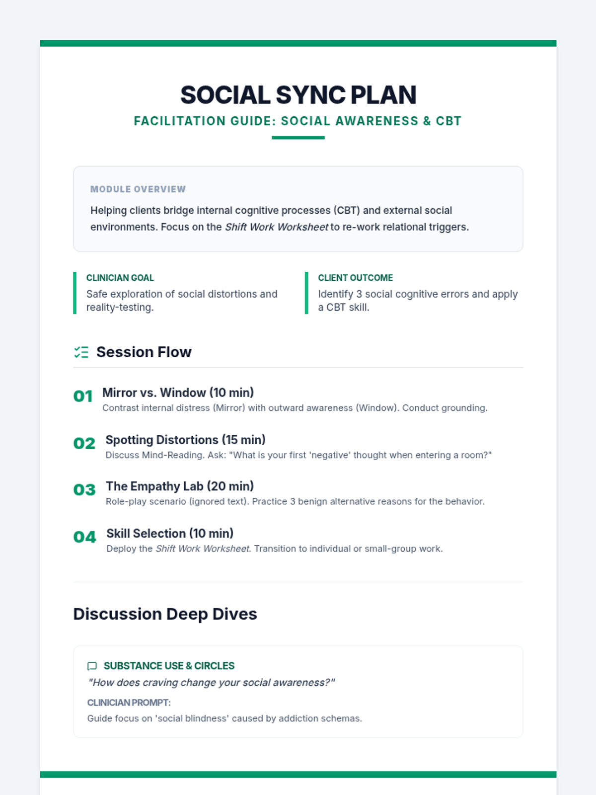 A clinician-facing lesson plan for facilitating social awareness and CBT group or individual sessions. Includes structured steps, discussion prompts, and trauma-informed guidance.