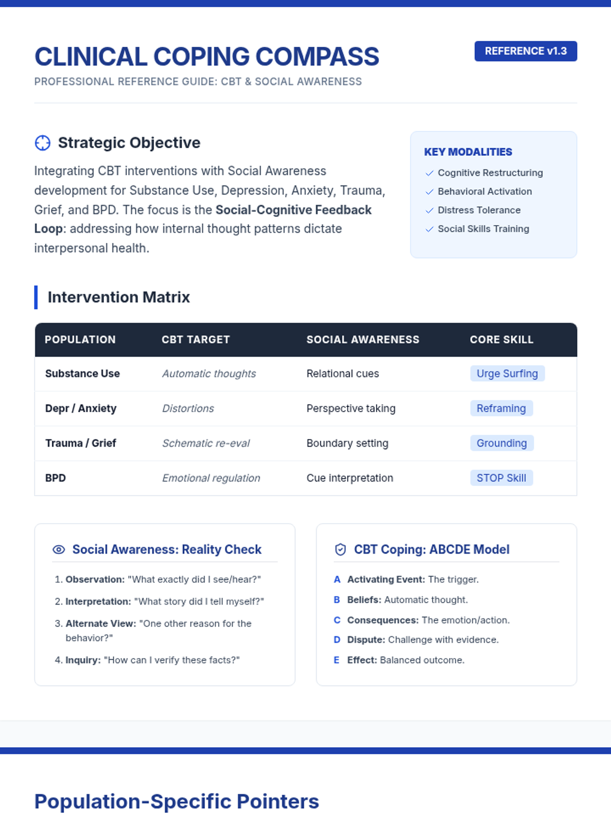 A high-density professional reference guide for clinical staff, mapping CBT interventions and social awareness strategies to specific patient populations including BPD, Trauma, and Substance Use.