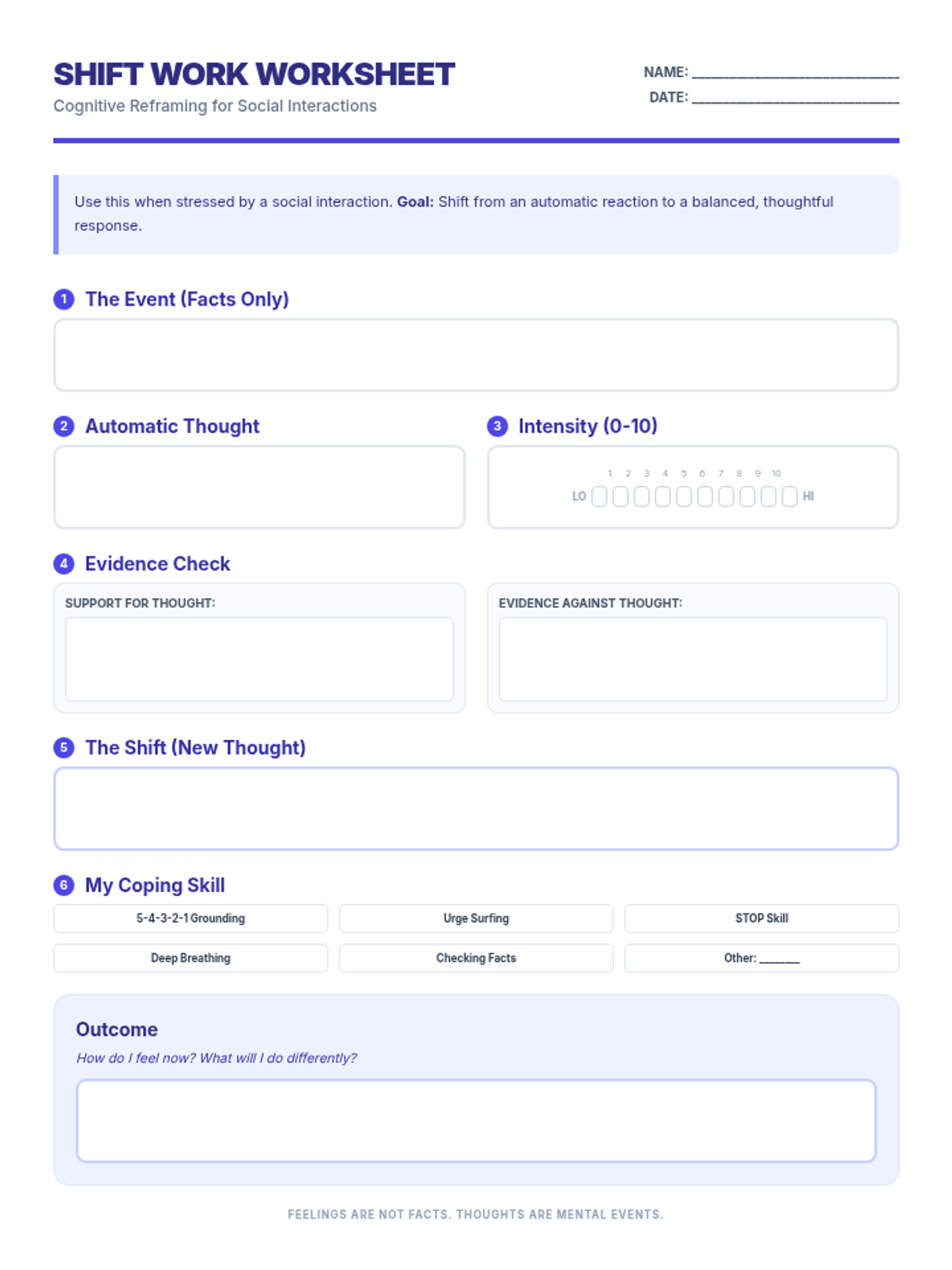 A client-facing CBT worksheet designed to help individuals process social interactions, identify cognitive distortions, and apply coping skills in real-time.