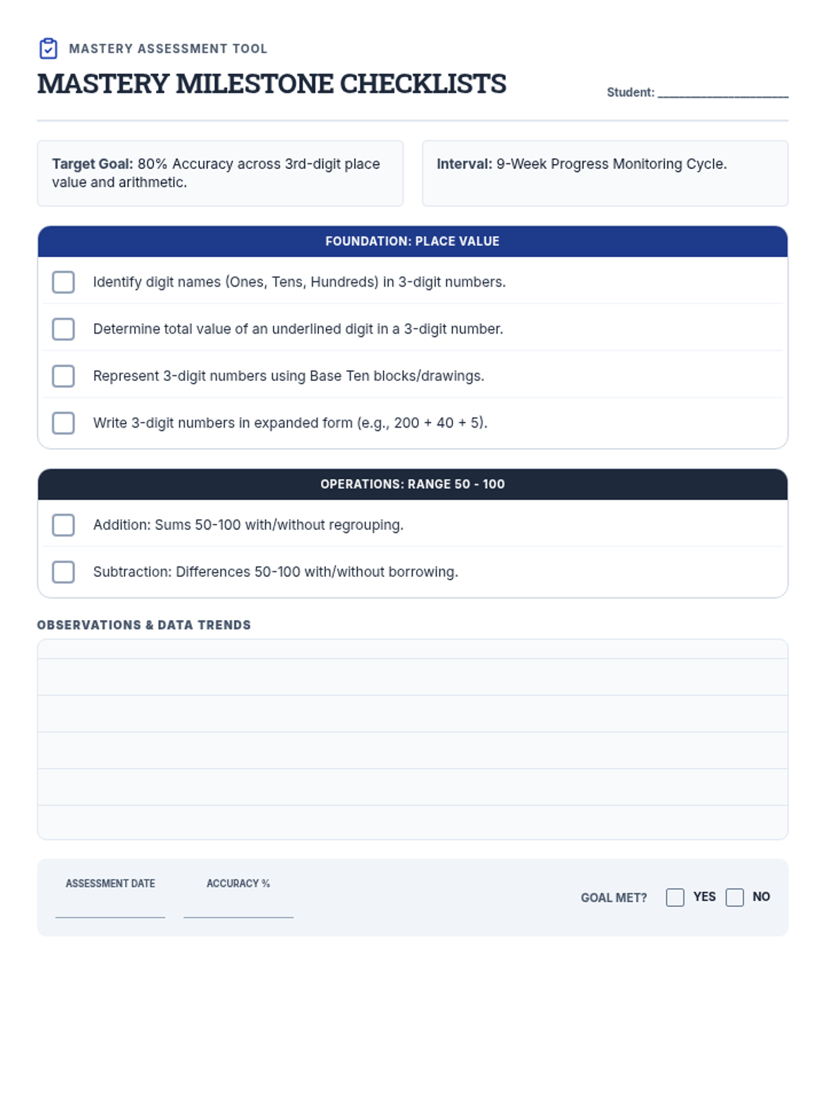 A single-page skills checklist for tracking place value and arithmetic mastery, featuring a lined observation area and quarterly assessment tracking fields.