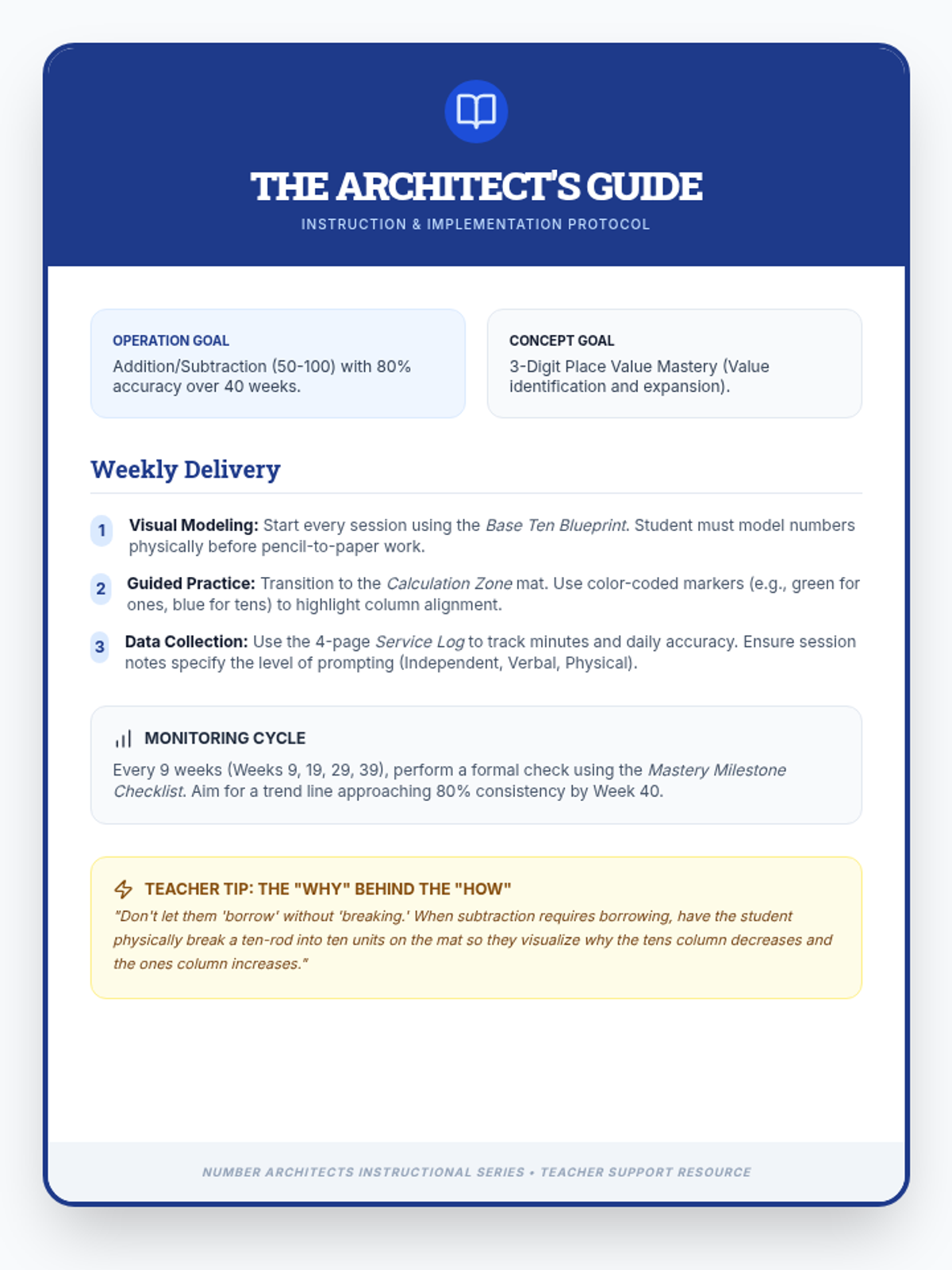 A single-page instructional guide for teachers, providing a 3-step delivery protocol, scaffolding strategies, and monitoring cycles for 2nd-grade math support.