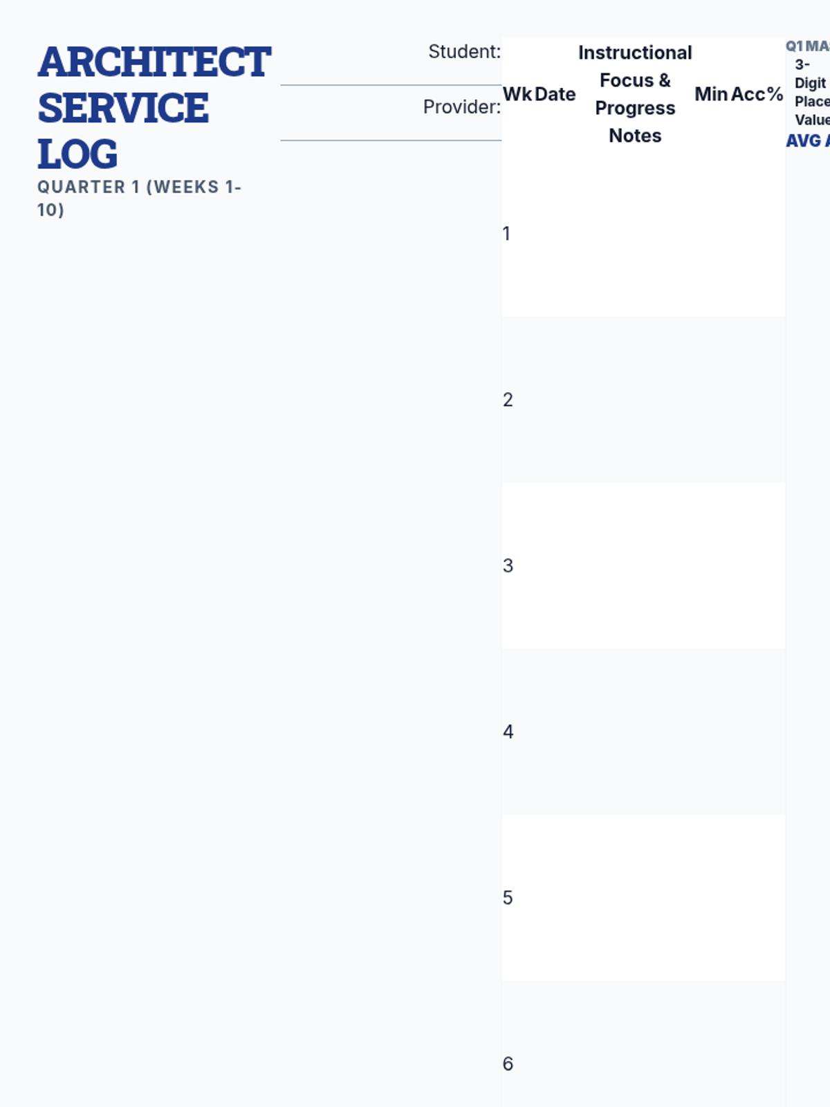 A professional 4-page service delivery log designed for educators to track 2x weekly support sessions over 40 weeks, with dedicated space for progress monitoring assessments at the end of each quarter.