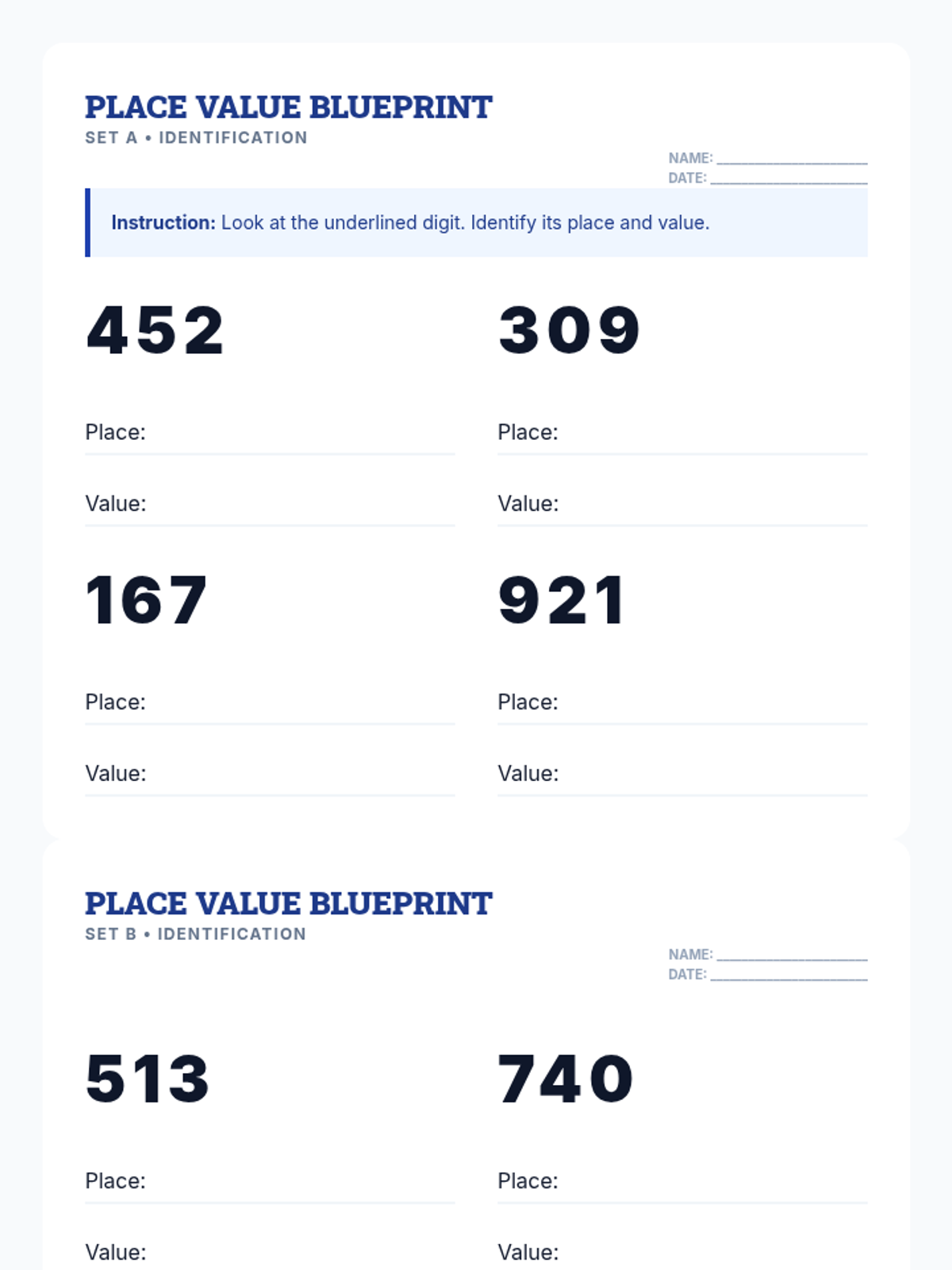 A structured 6-page student practice packet for place value and multi-digit arithmetic, featuring 24 problems across identification, addition, and subtraction with sums/differences between 50 and 100.
