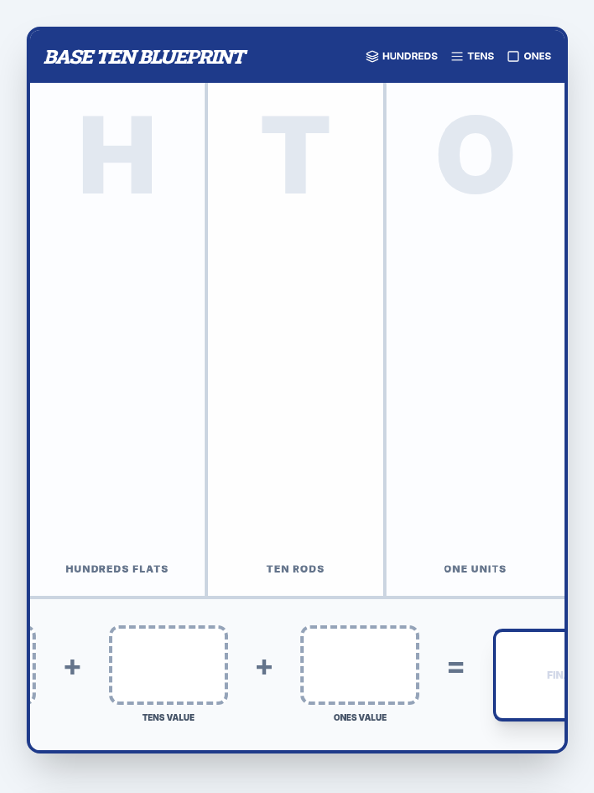 Two distinct high-contrast visual mats: a Base Ten Blueprint for place value modeling and a Calculation Zone for guided addition and subtraction with regrouping support.