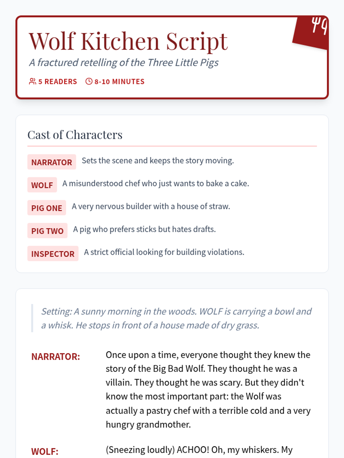 An ultra-compact, one-page document containing the Wolf Kitchen reader's theater script and an 8-question RL.1 exit ticket to minimize paper use.