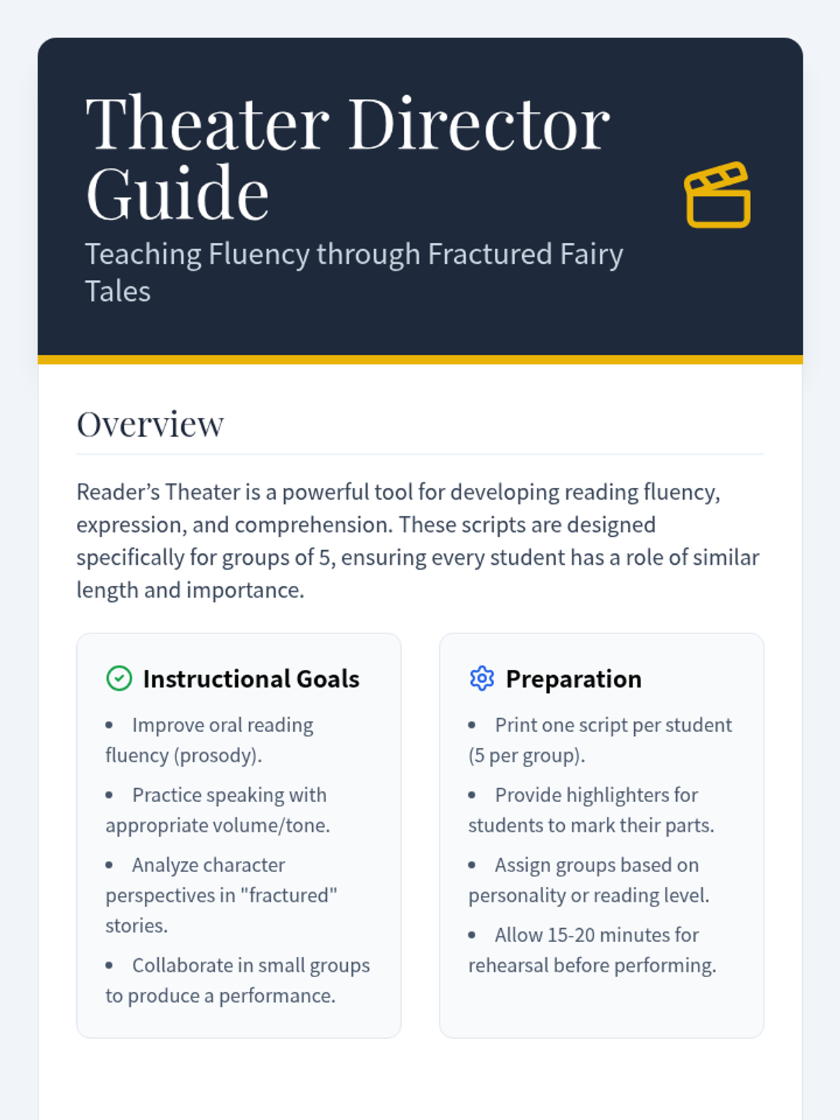 A teacher's guide for implementing reader's theater in the classroom, including pacing suggestions, instructional goals, and discussion prompts.