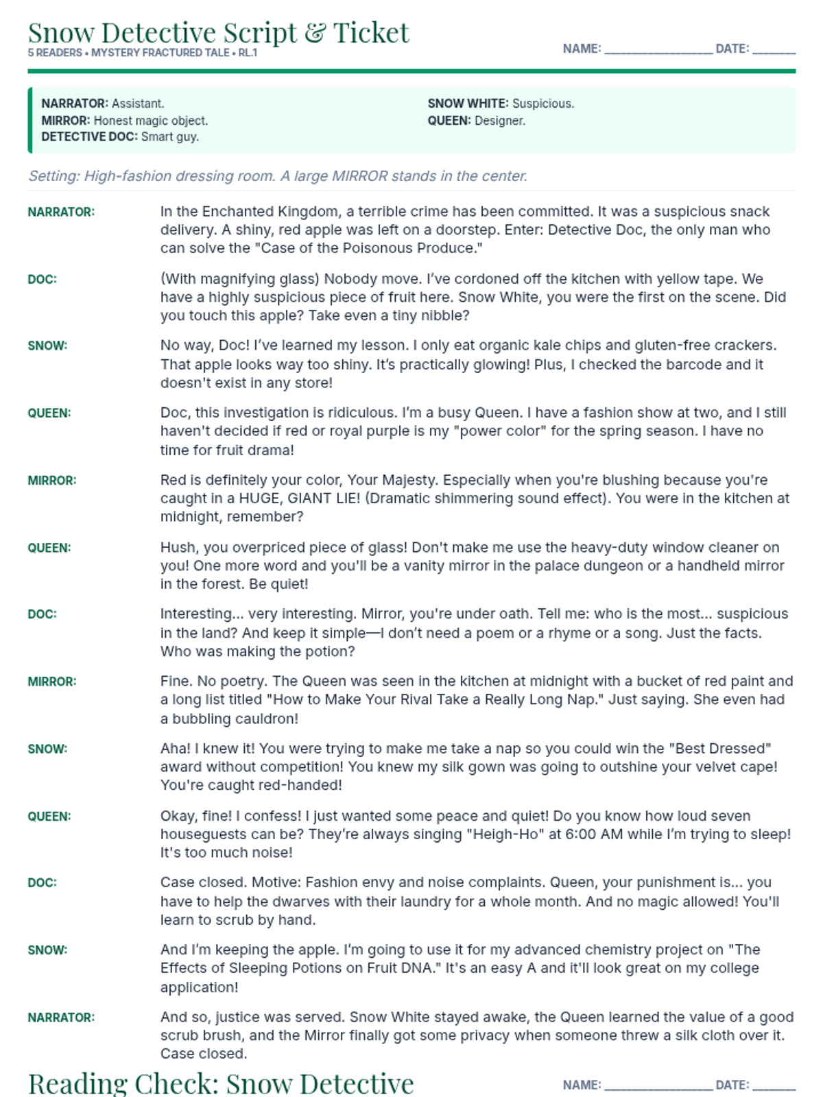 An ultra-compact, one-page document containing the Snow Detective reader's theater script and an 8-question RL.1 exit ticket to minimize paper use.