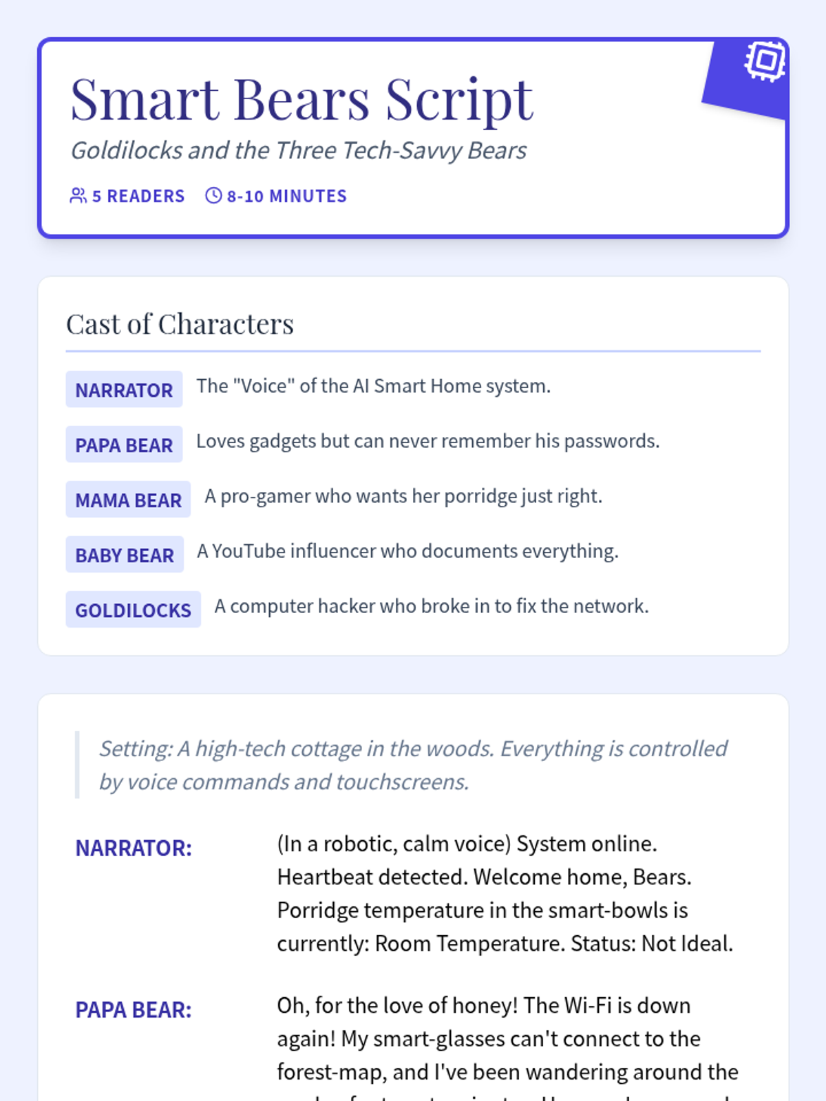 An ultra-compact, one-page document containing the Smart Bears reader's theater script and an 8-question RL.1 exit ticket to minimize paper use.