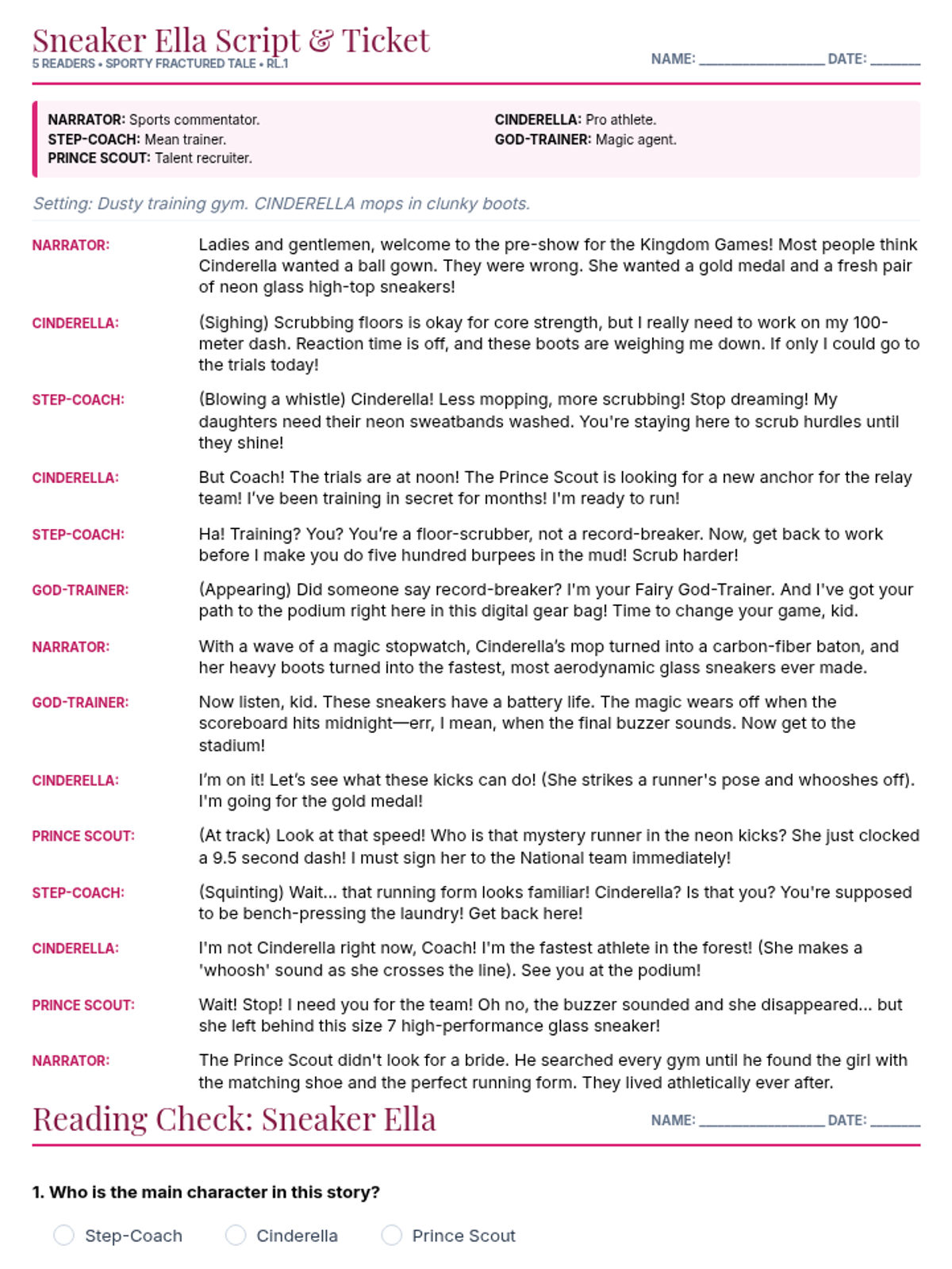 An ultra-compact, one-page document containing the Sneaker Ella reader's theater script and an 8-question RL.1 exit ticket to minimize paper use.