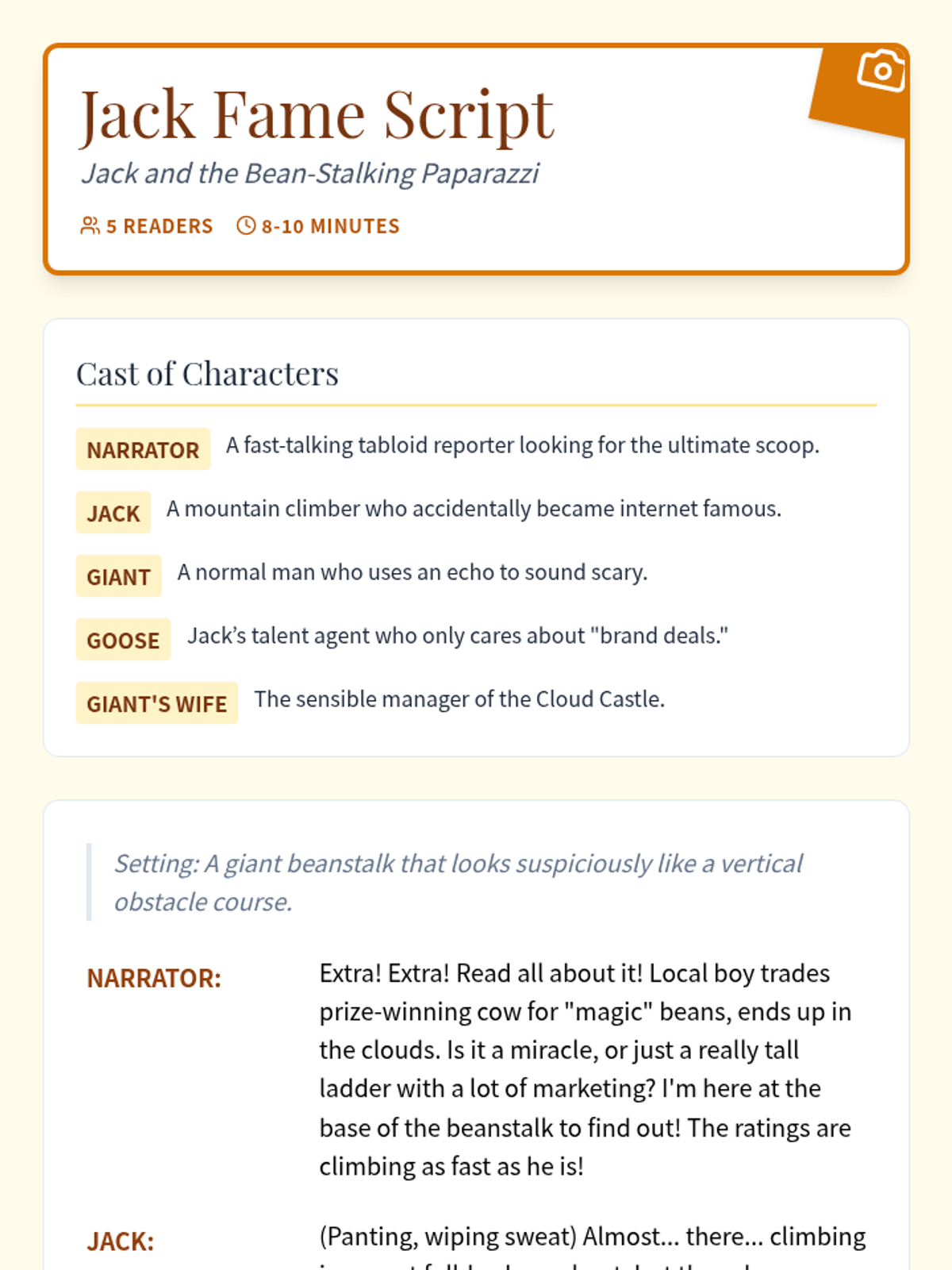 An ultra-compact, one-page document containing the Jack Fame reader's theater script and an 8-question RL.1 exit ticket to minimize paper use.