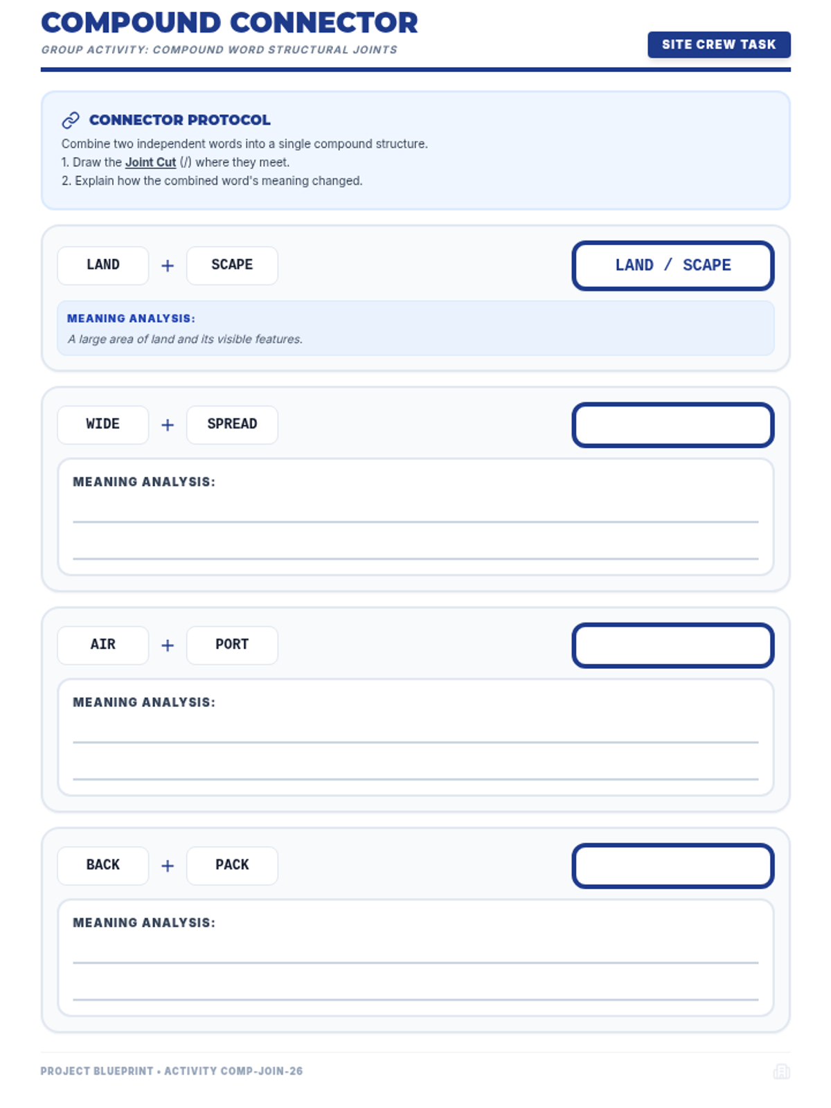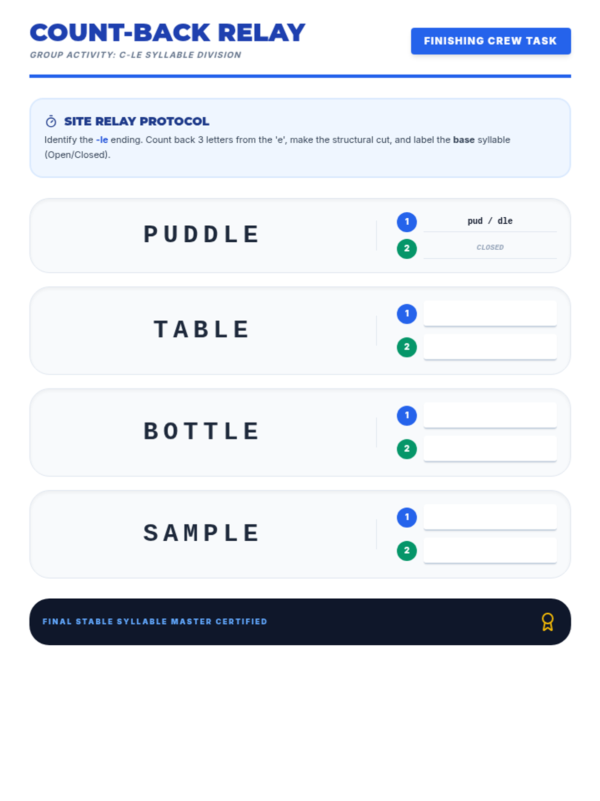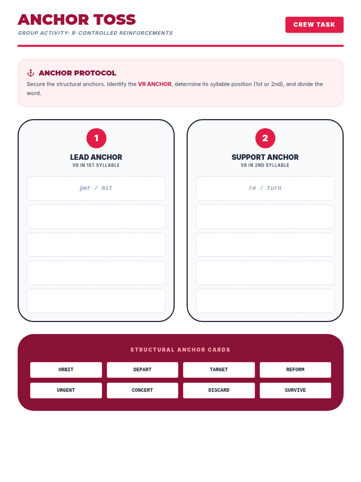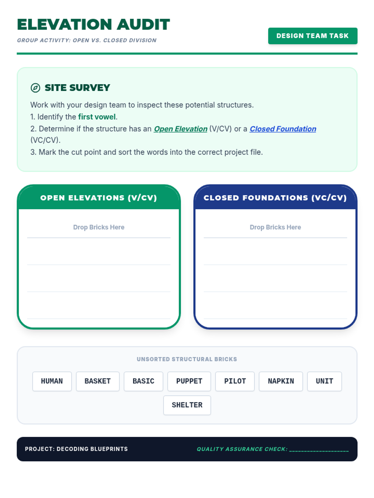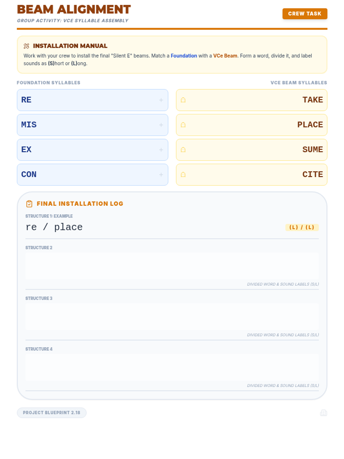 A cooperative word-building activity for Unit 2, Lesson 3, where students combine foundation syllables with VCe syllables to create and divide academic multisyllabic words. Revised for single-page fit, sound labeling consistency, and increased writing space.