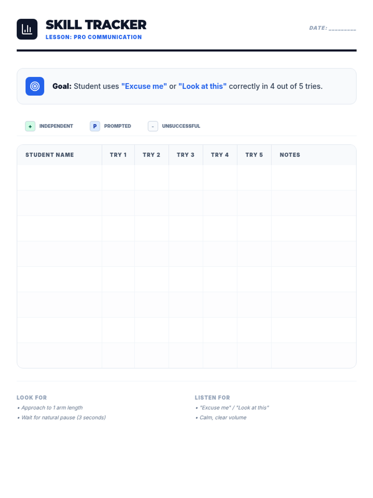 A teacher-facing data collection tool for monitoring student progress in using scripted attention-seeking phrases. Includes space for tracking multiple attempts, prompt levels, and notes for up to 15 students per page.