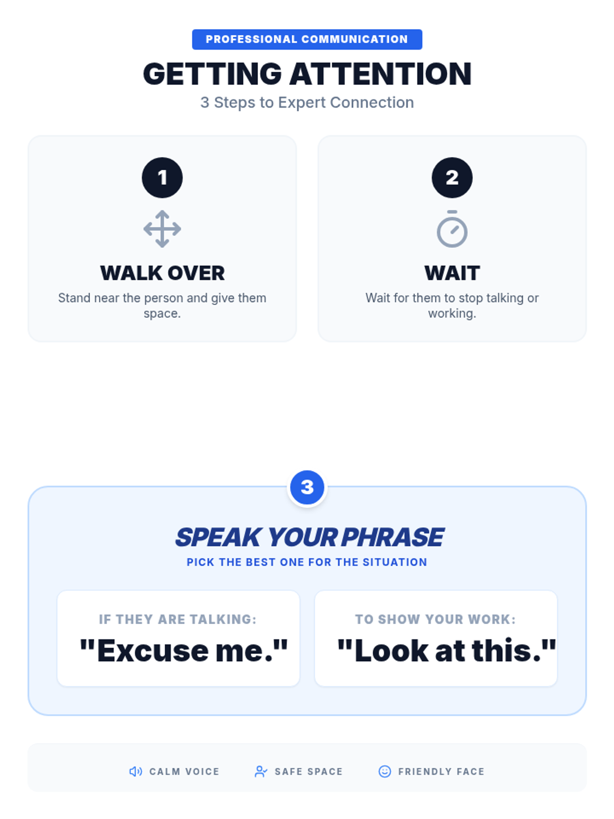 A visually clear, step-by-step communication poster. Follows a logical sequence from approaching a person to waiting and then choosing the appropriate phrase. Designed for high legibility and simplicity.