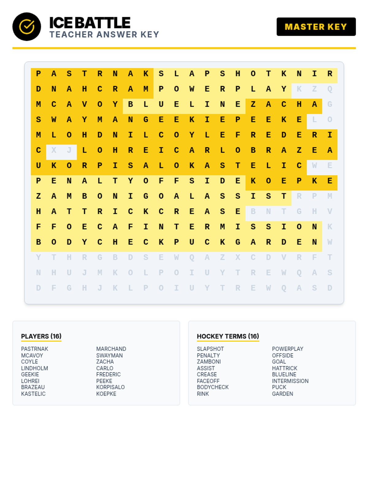 A detailed teacher answer key for the Ice Battle Wordsearch. Highlights all 32 hidden words in the 20x20 grid, distinguishing between players and general hockey terms.