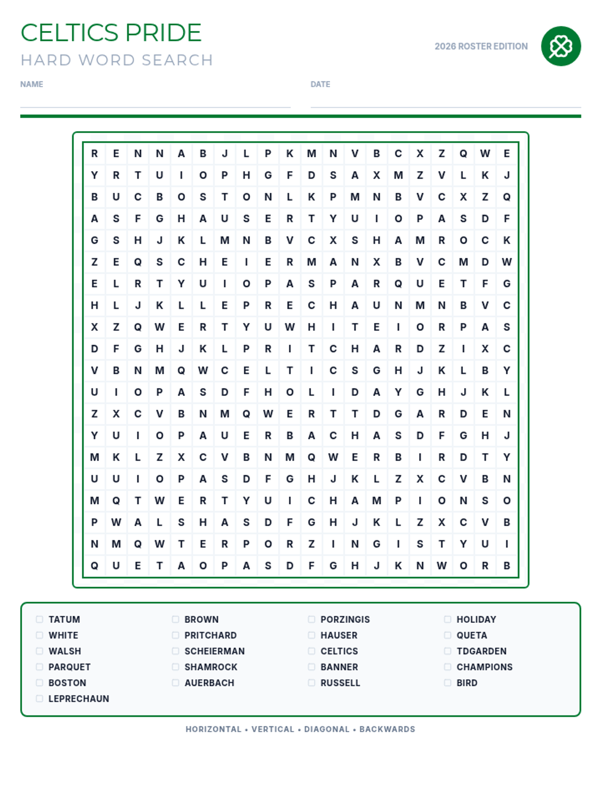 A high-difficulty word search featuring the 2026 Boston Celtics roster and franchise terms. Includes backward and diagonal word placements.