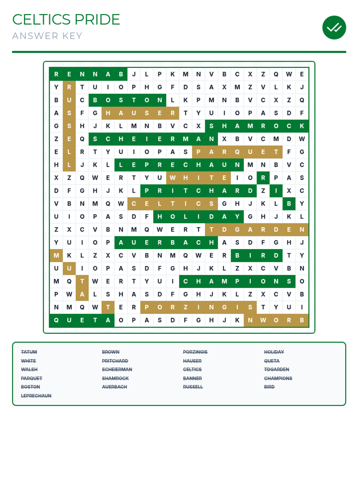The teacher answer key for the Celtics Pride Word Search, highlighting the locations of all hidden words in the 20x20 grid.