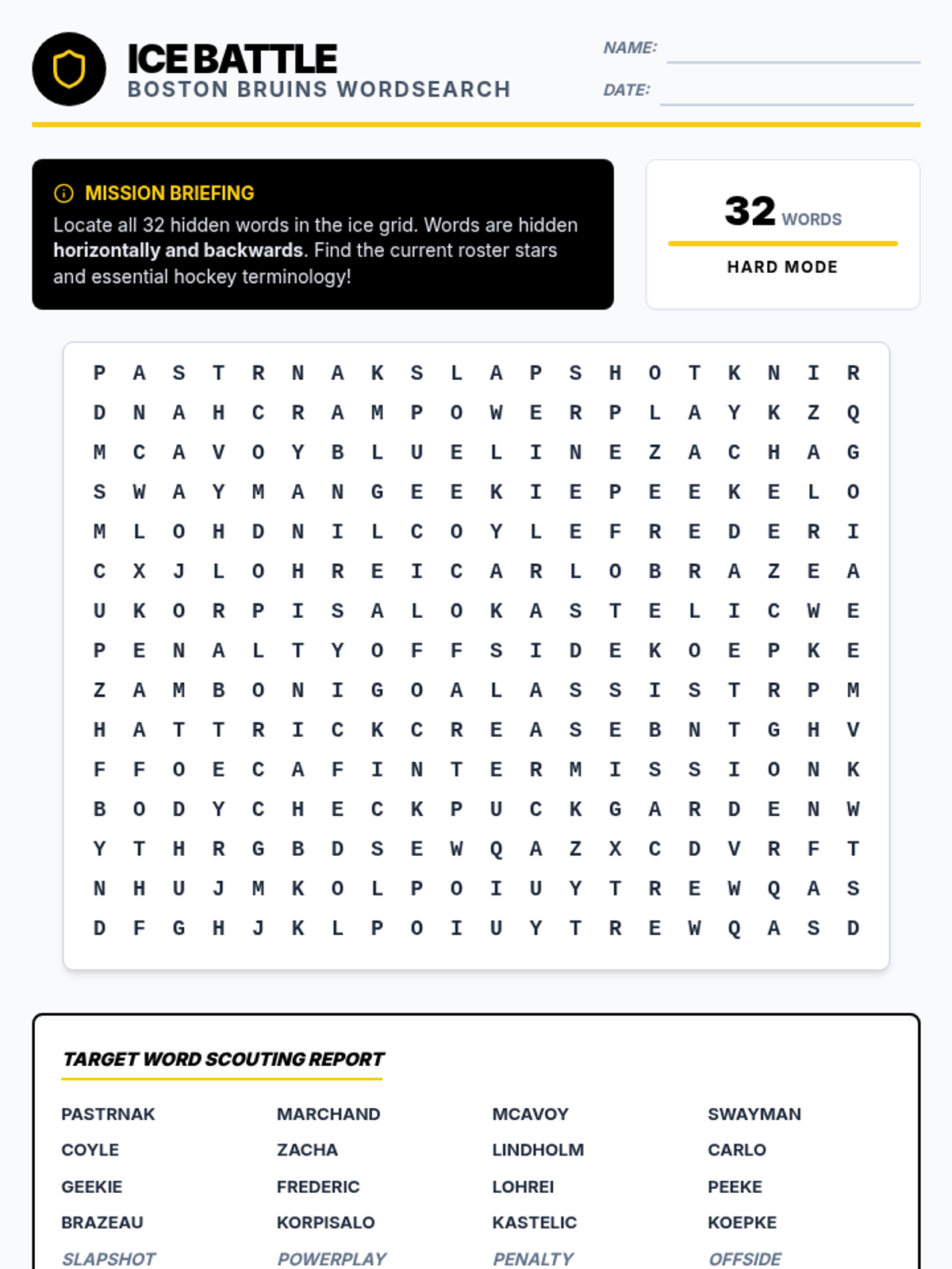 A pro-level Boston Bruins wordsearch featuring 32 words including current roster players and essential hockey terminology. Designed with a clean, sports-themed aesthetic in the team's signature black and gold colors.