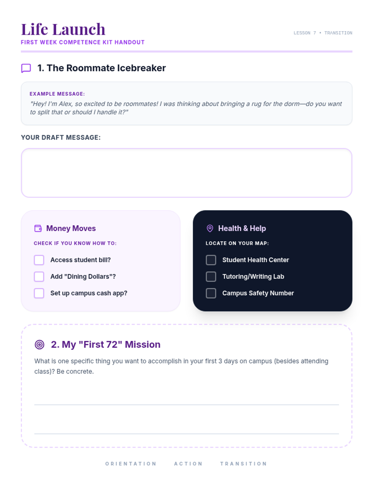A 4-slide presentation focused on the logistical and social skills needed for the first 72 hours of college to reduce transition anxiety.