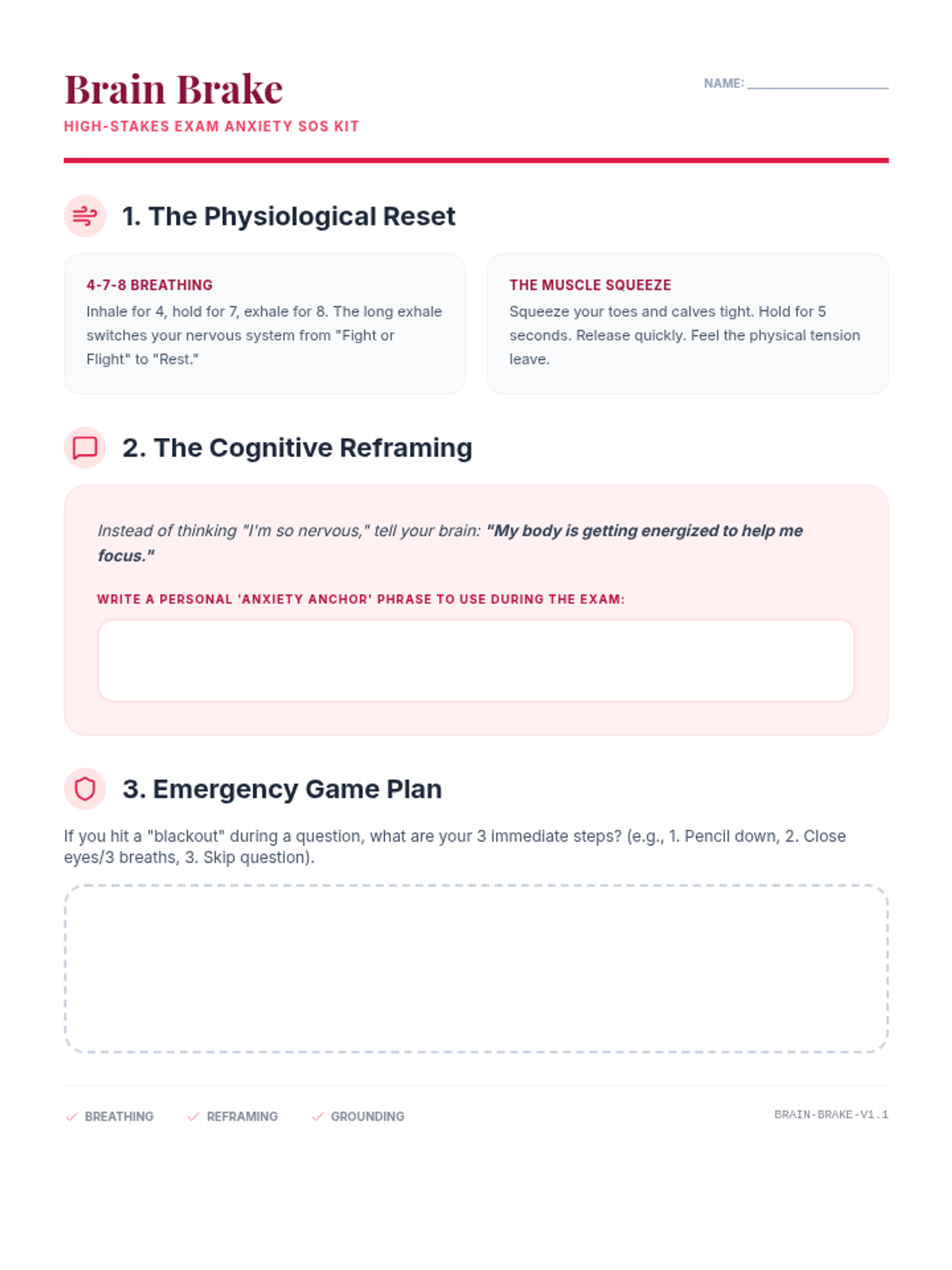 A practical toolkit and reflection sheet for students to prepare their own personalized anxiety-reduction plan for high-stakes testing. Updated to fit on one page with improved work space.