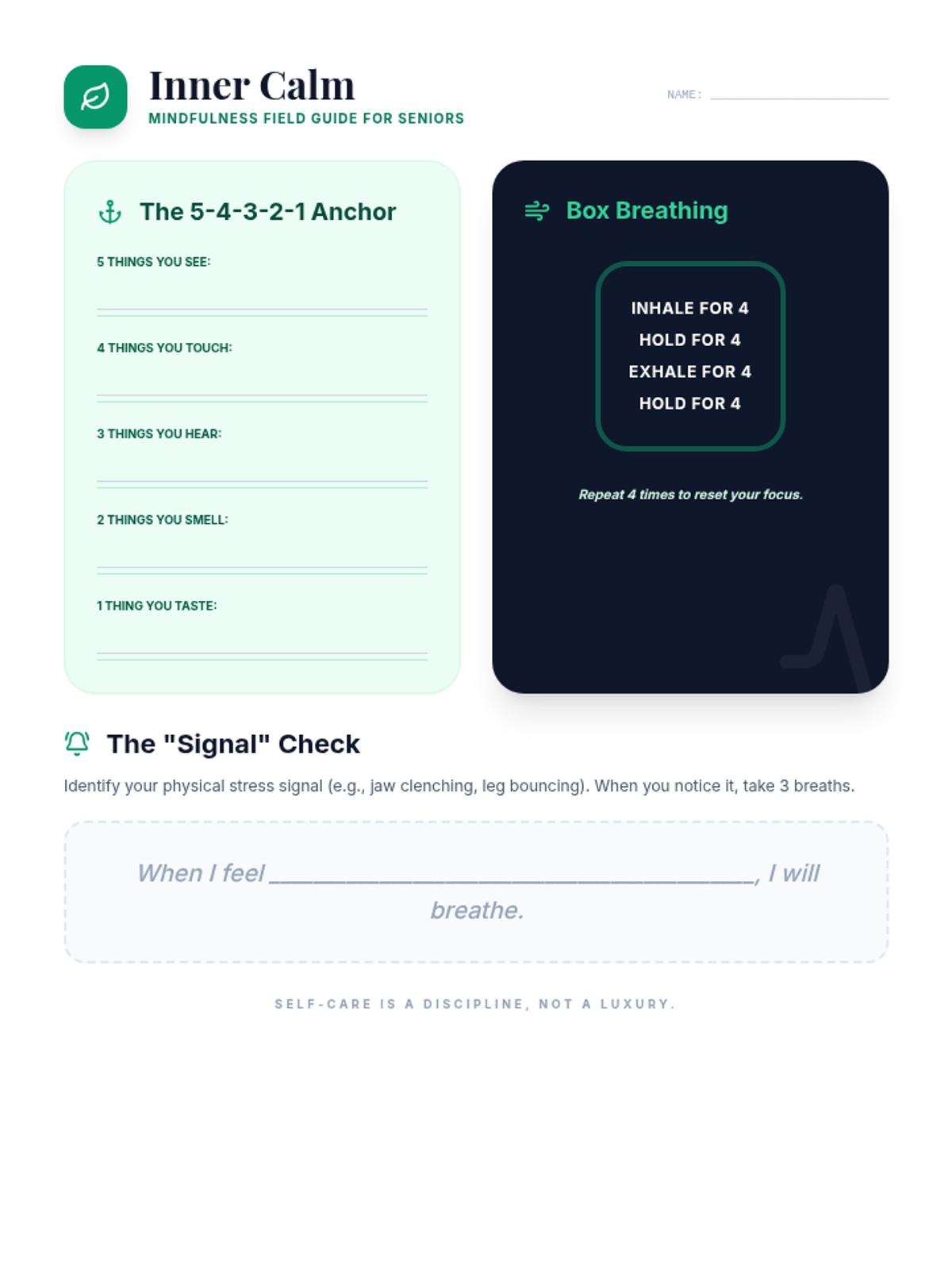 A grounding "field guide" handout featuring sensory scan exercises and box breathing techniques for students. Updated with better writing space, higher contrast, and one-page layout.