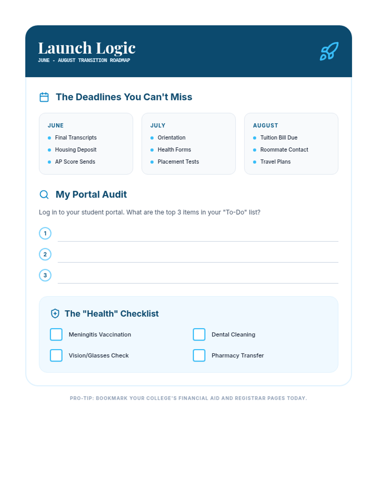 A logistical checklist and portal audit worksheet for seniors to manage their summer transition to college. Updated with higher contrast and fixed page breaks.