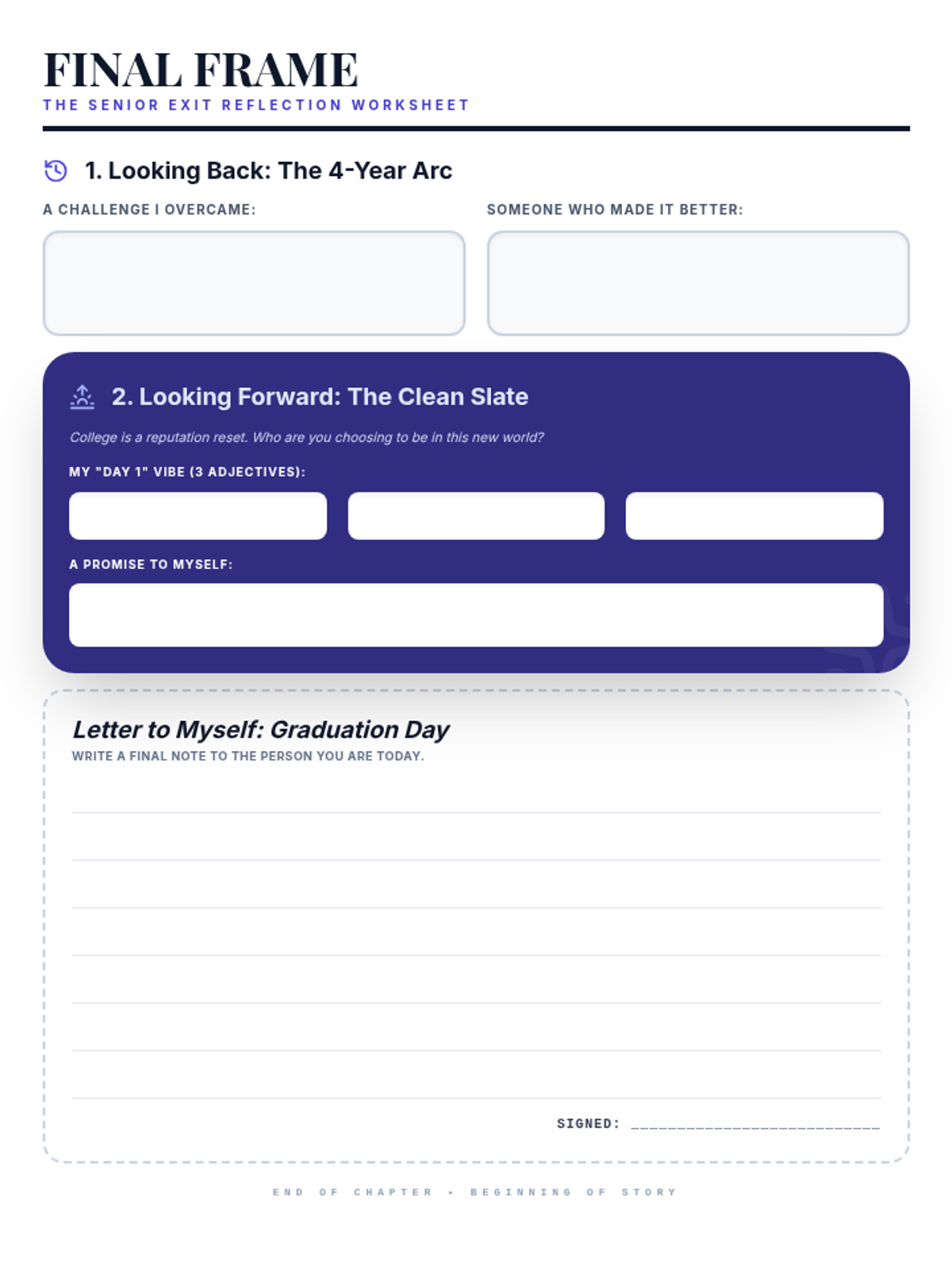 A final reflection worksheet for seniors to capture growth and set intentions. Updated with higher contrast, better work areas, and condensed layout to fit on one page.