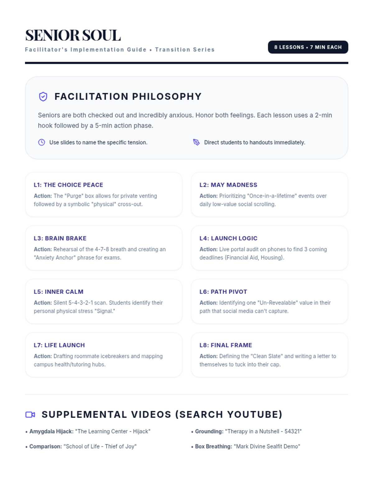 A comprehensive facilitation guide for the 8-lesson "Senior Soul" transition series. Updated with detailed action steps, recommended video titles, and fixed page breaks.