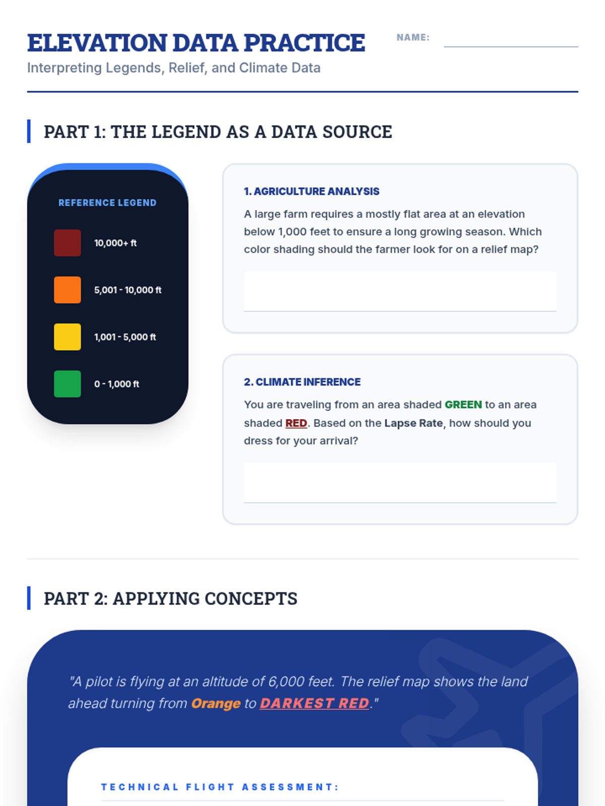 GED-aligned worksheet for elevation maps, focusing on using legends to make inferences about agricultural suitability, climate shifts, and aviation safety.