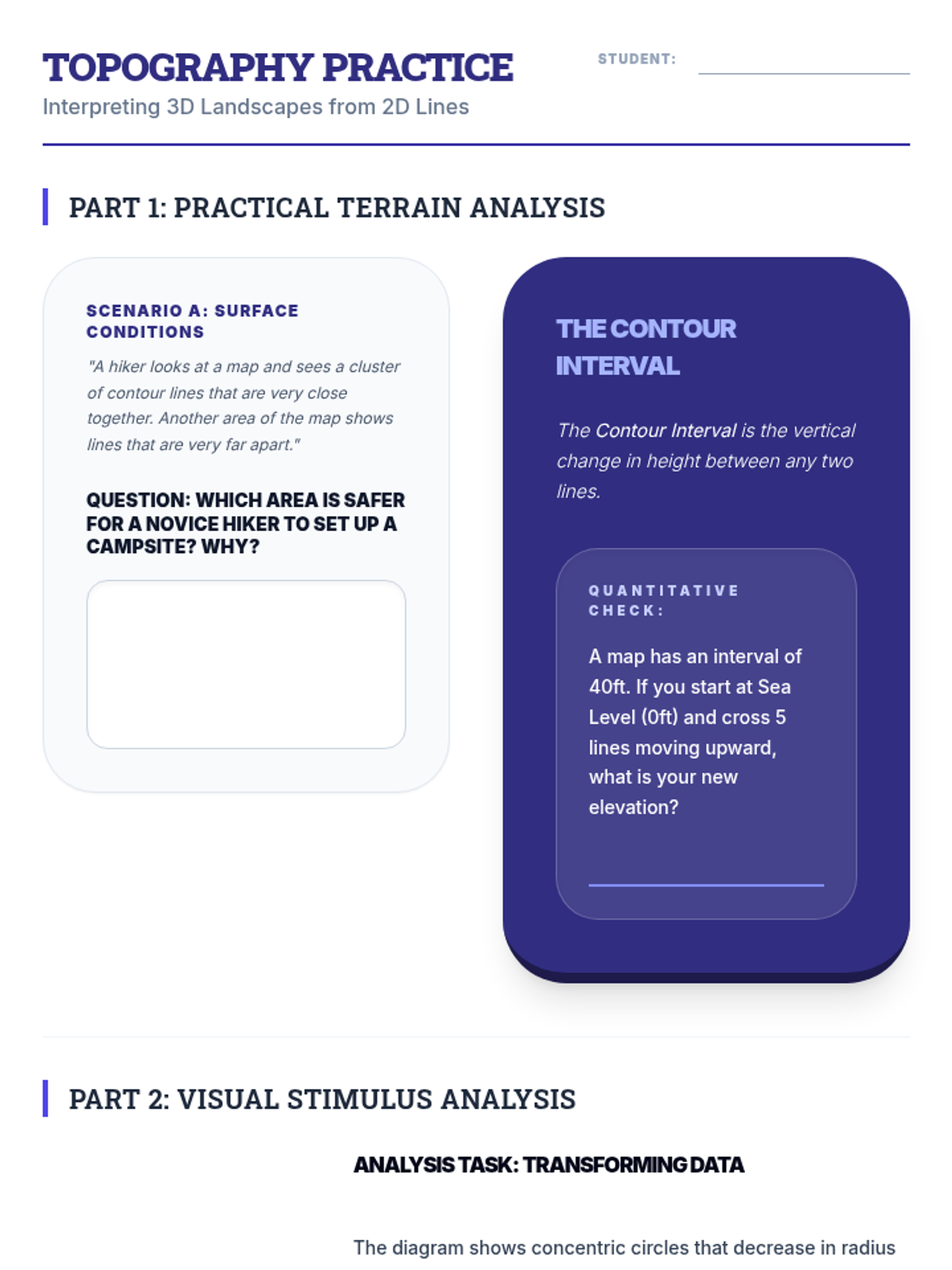 GED-aligned worksheet for topographic maps, focusing on practical terrain application, contour interval math, and visualizing 3D landforms from 2D diagrams.