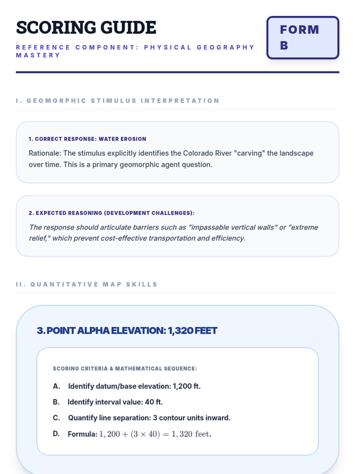 Teacher-facing answer key for the Advanced Mapping Mastery Quiz, providing technical geological explanations and mathematical solutions for high-school level analysis.