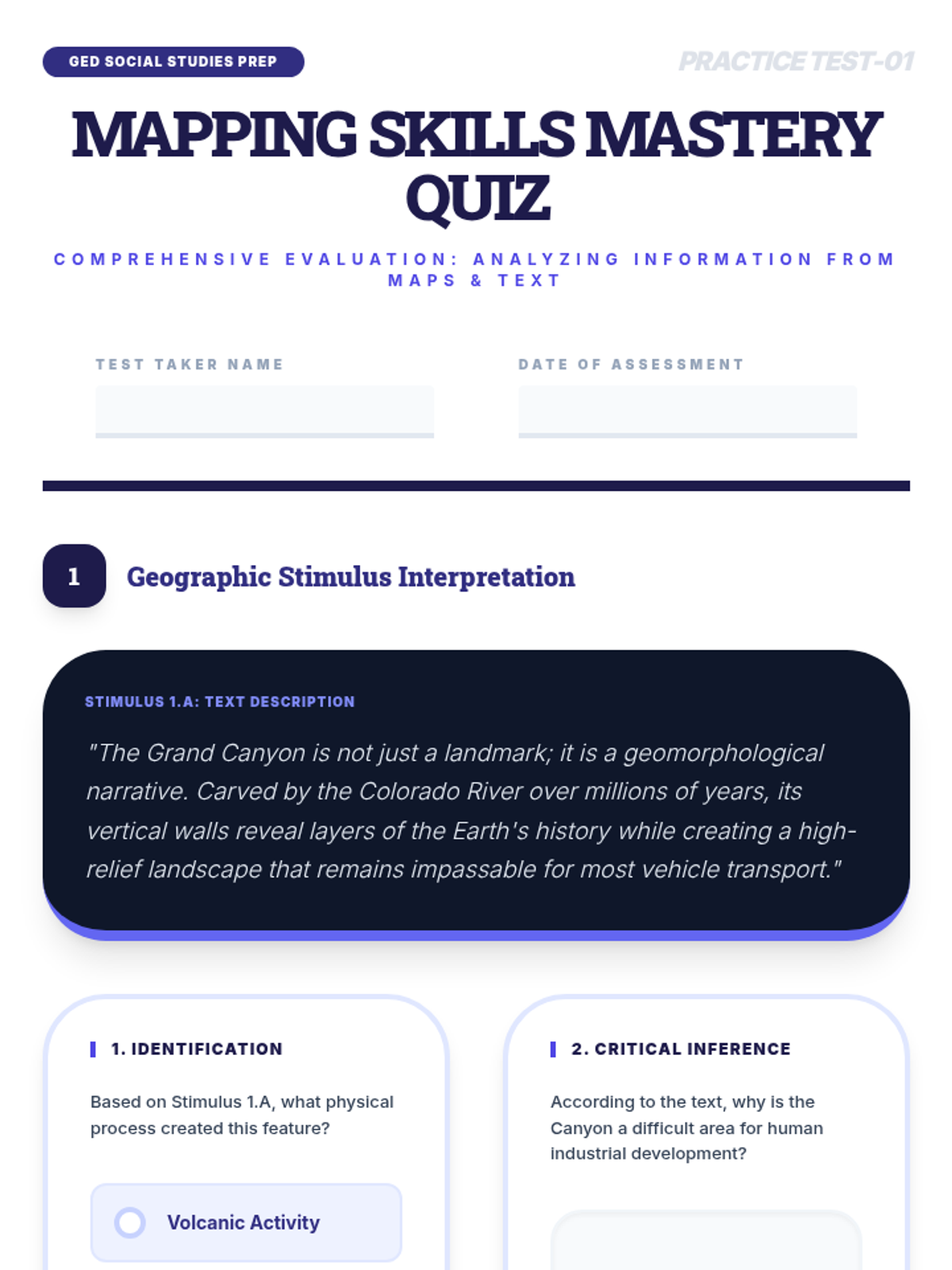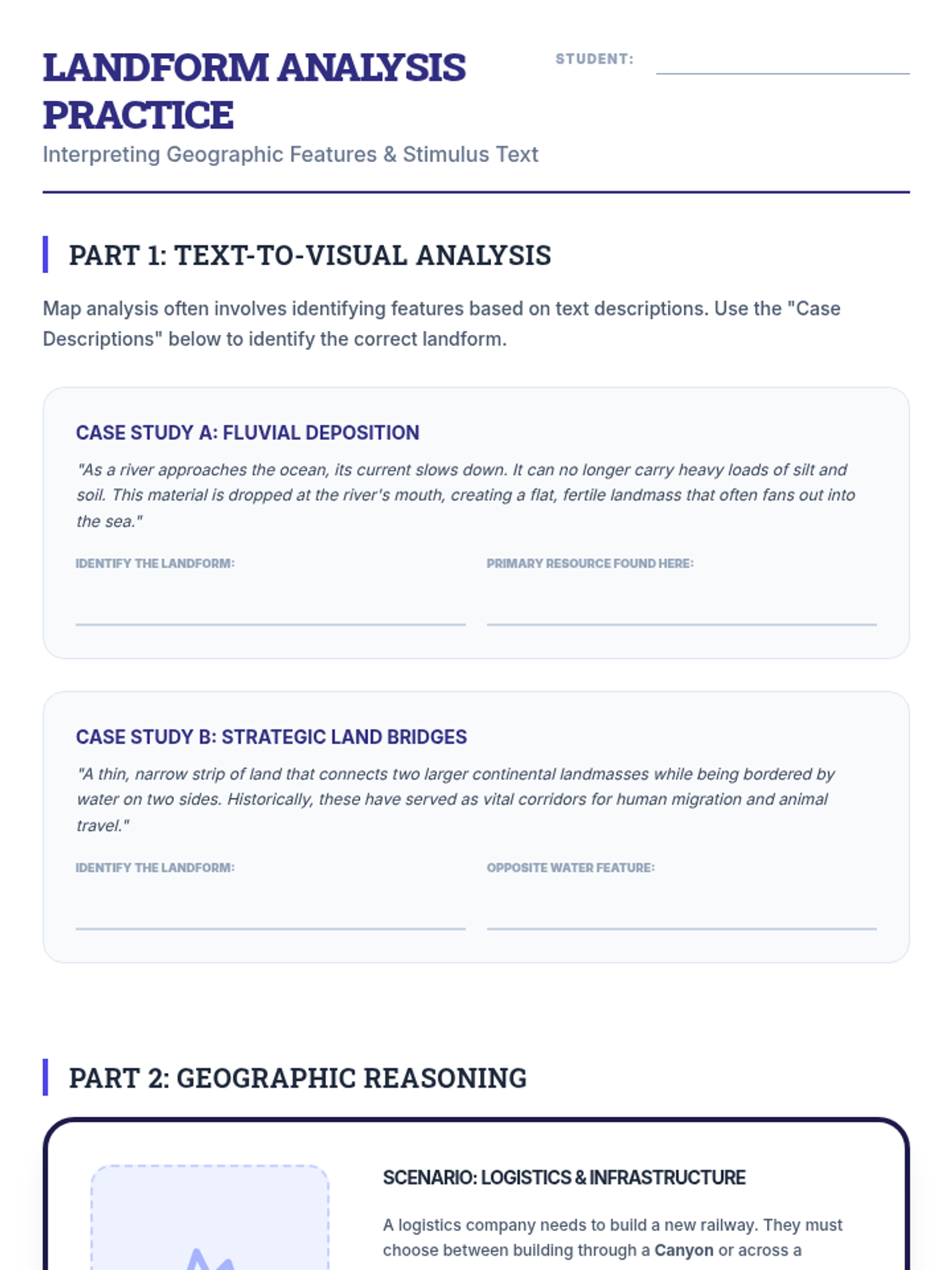 GED-aligned worksheet focusing on identifying landforms from text-based stimulus and applying geographic reasoning to transportation and resource scenarios.
