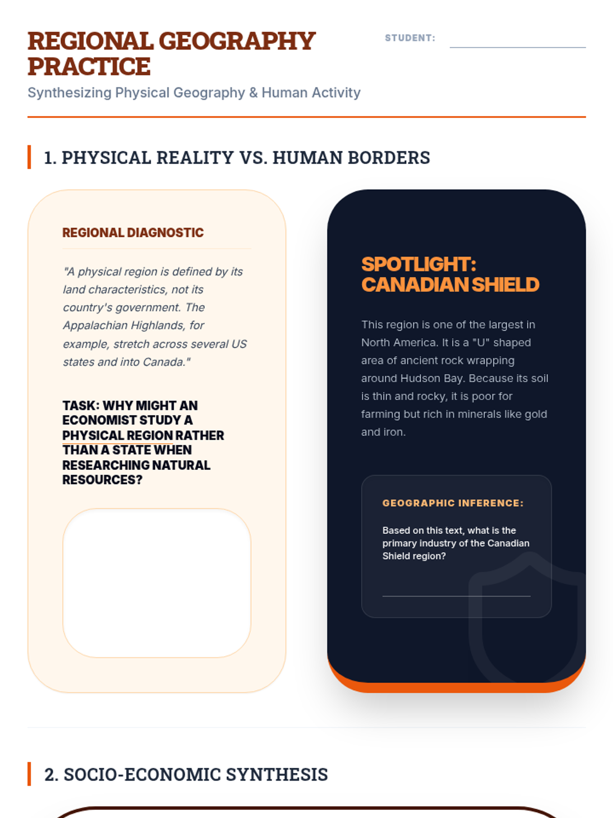 GED-aligned worksheet for physiographic regions, focusing on interpreting regional text descriptions and analyzing how physical terrain dictates regional economies and industry.
