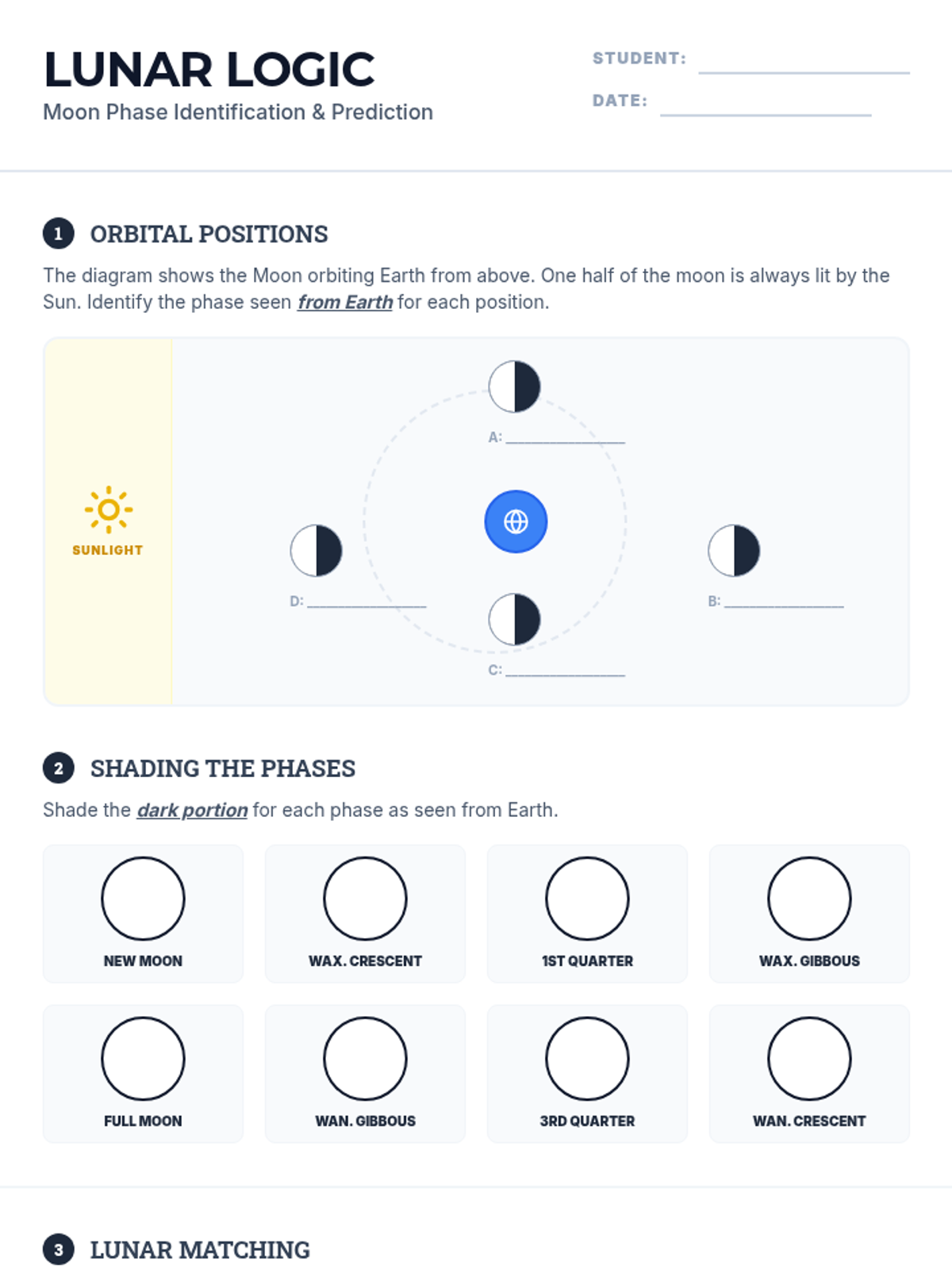 A student worksheet featuring diagram labeling of orbital positions, shading exercises for the eight lunar phases, term matching, and predictive short-answer questions.