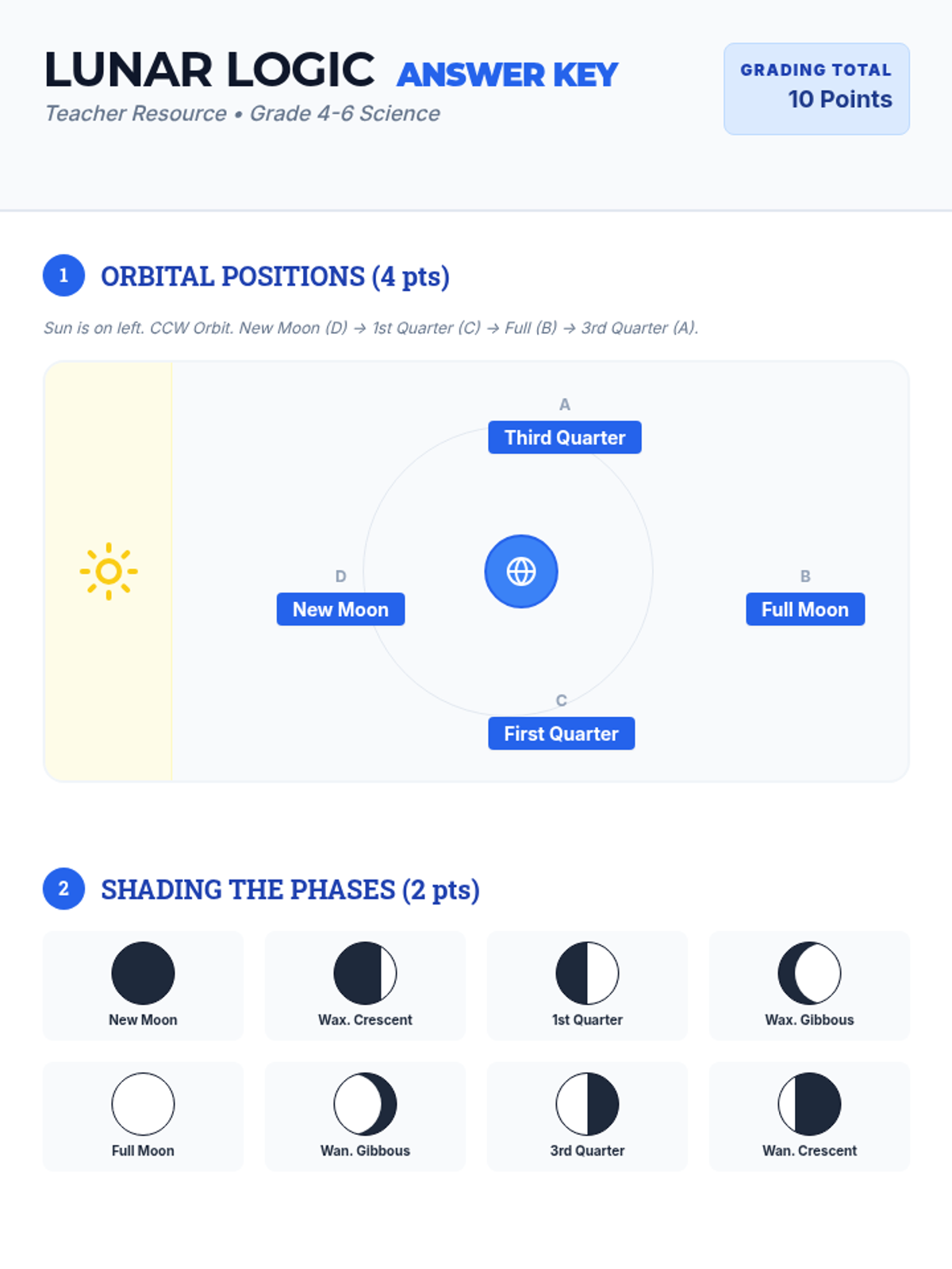 A comprehensive answer key for the Lunar Logic worksheet, providing correctly labeled diagrams, shaded lunar phases, matching solutions, and sample short-answer responses with scoring guidelines.