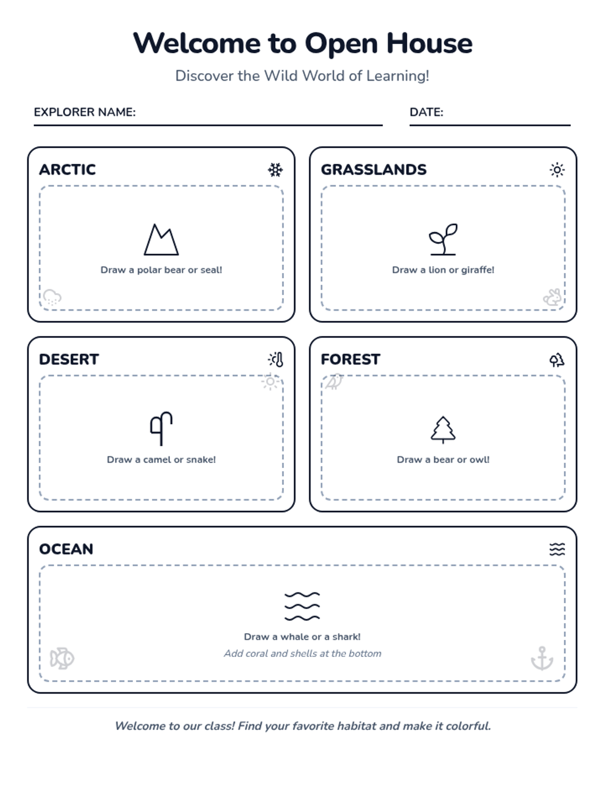 A one-page Open House coloring sheet featuring five distinct habitats (Arctic, Grasslands, Desert, Forest, and Ocean) with simple line-art icons and drawing prompts for students.