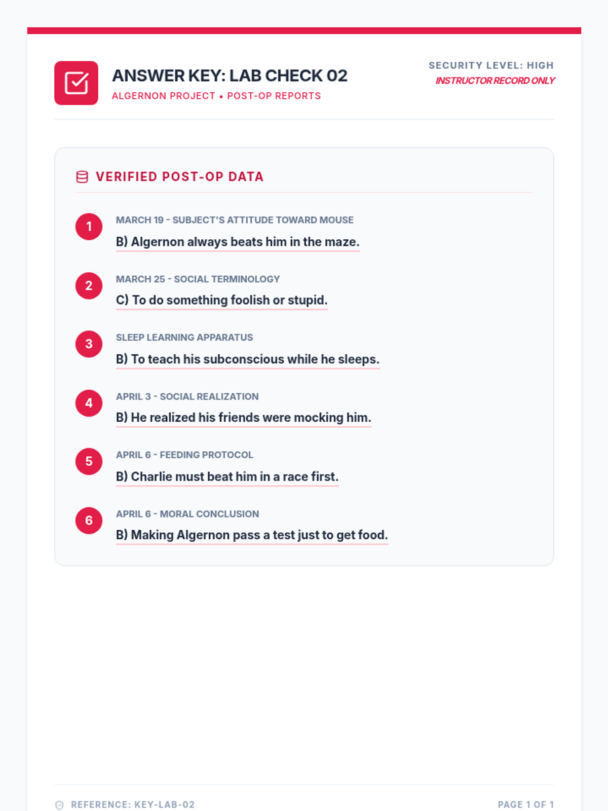 A teacher's answer key for the Post-Op Bell Ringer, providing correct responses for 6 multiple-choice questions covering progress reports from March 19 to April 6.