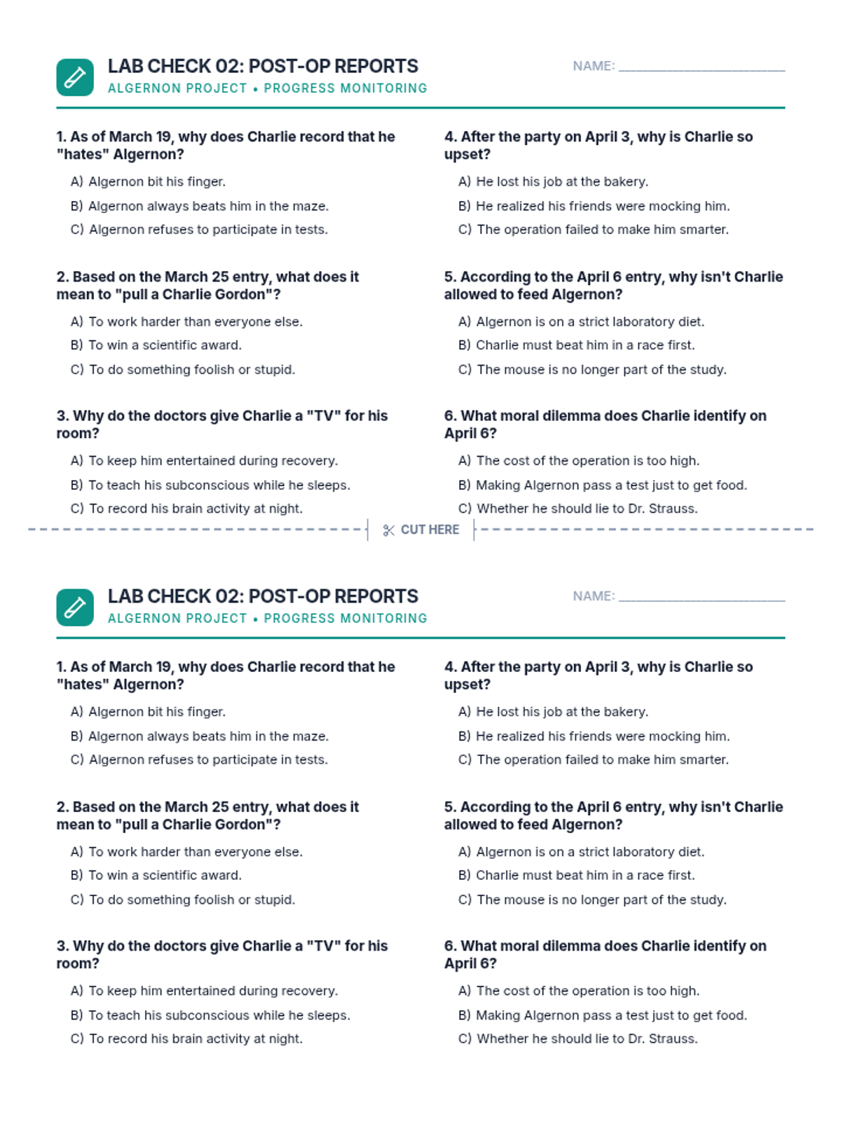 A 2-up printable bell ringer for "Flowers for Algernon" focusing on progress reports from March 19 to April 6, featuring 6 multiple-choice comprehension questions.