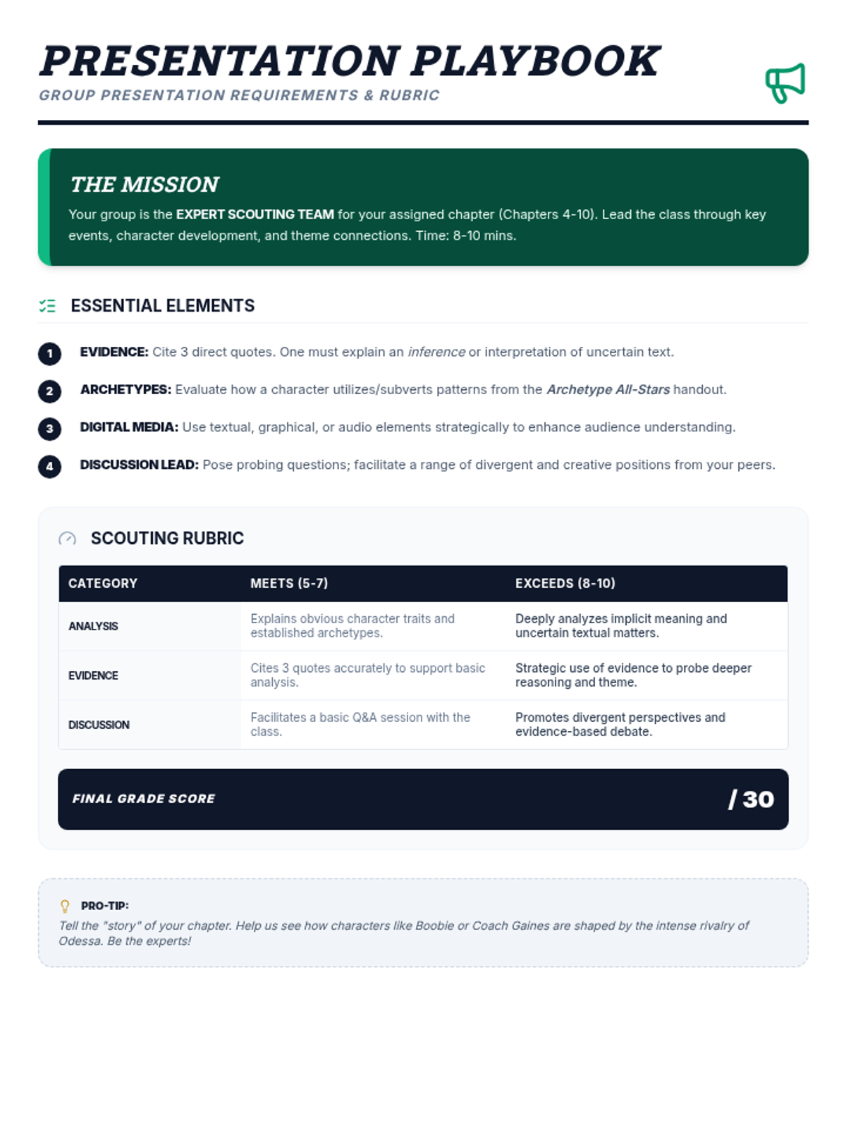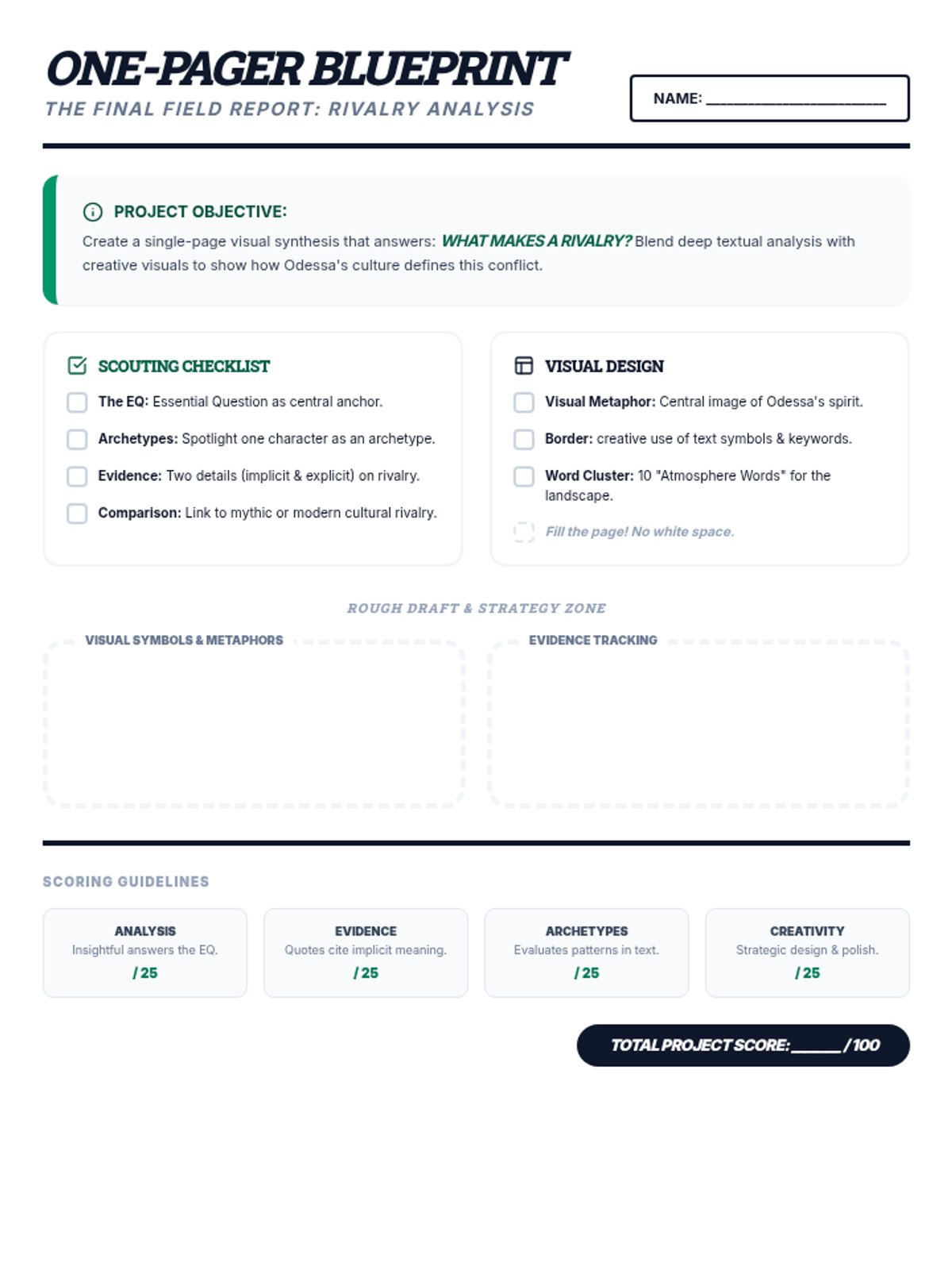 A student project guide and rubric for the final One-Pager project, synthesizing themes of rivalry, archetypes, and character development in Friday Night Lights.