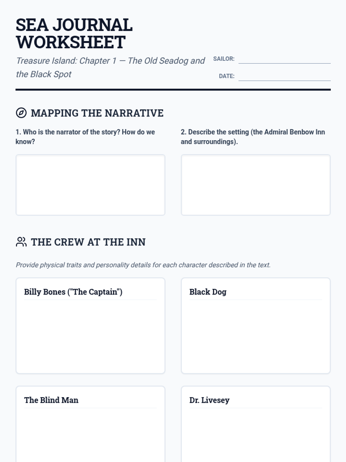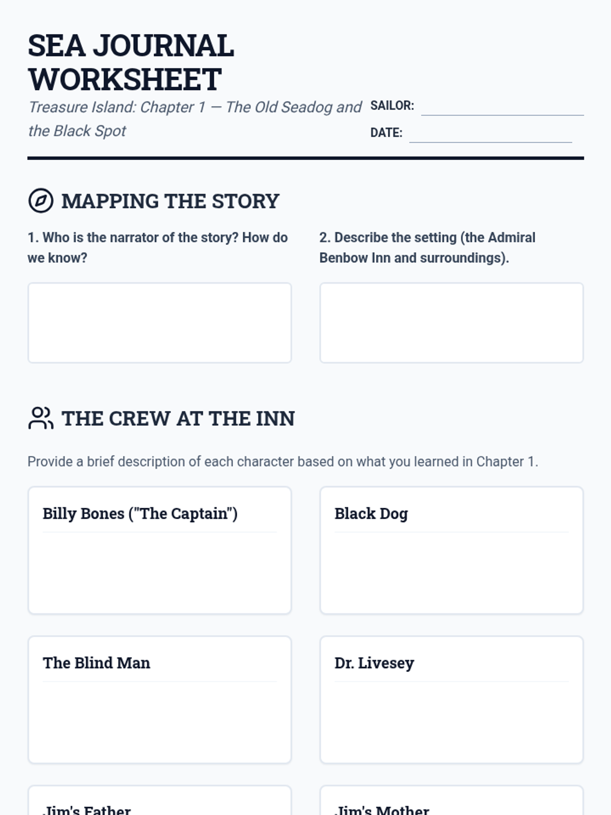 Revised student worksheet for Chapter 1 with improved spacing, larger character description boxes, and better page breaks to ensure content consistency.