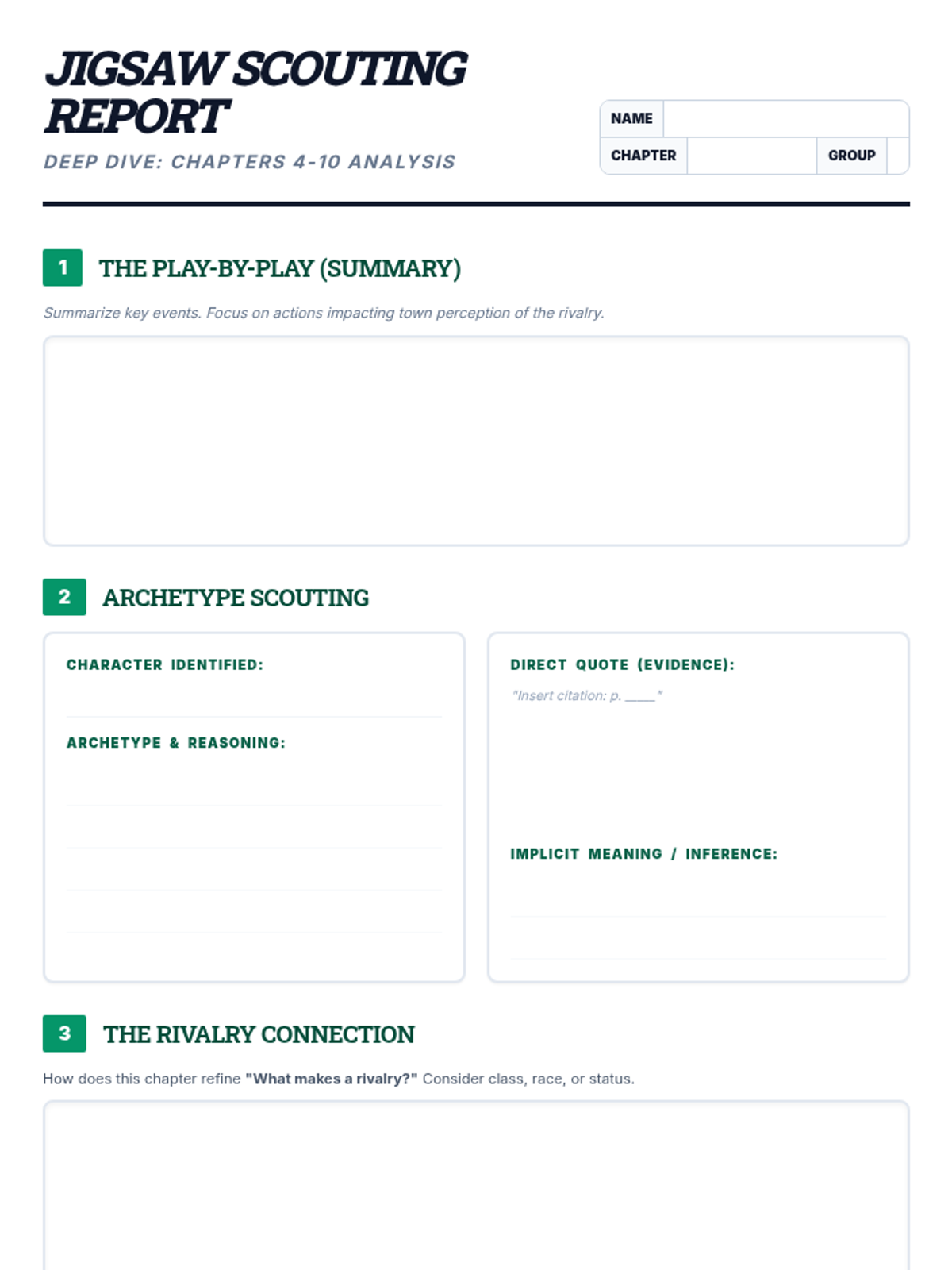 A graphic organizer for student groups to analyze their assigned Jigsaw chapter (Chapters 4-10) of Friday Night Lights, focusing on archetypes, evidence, and theme development.