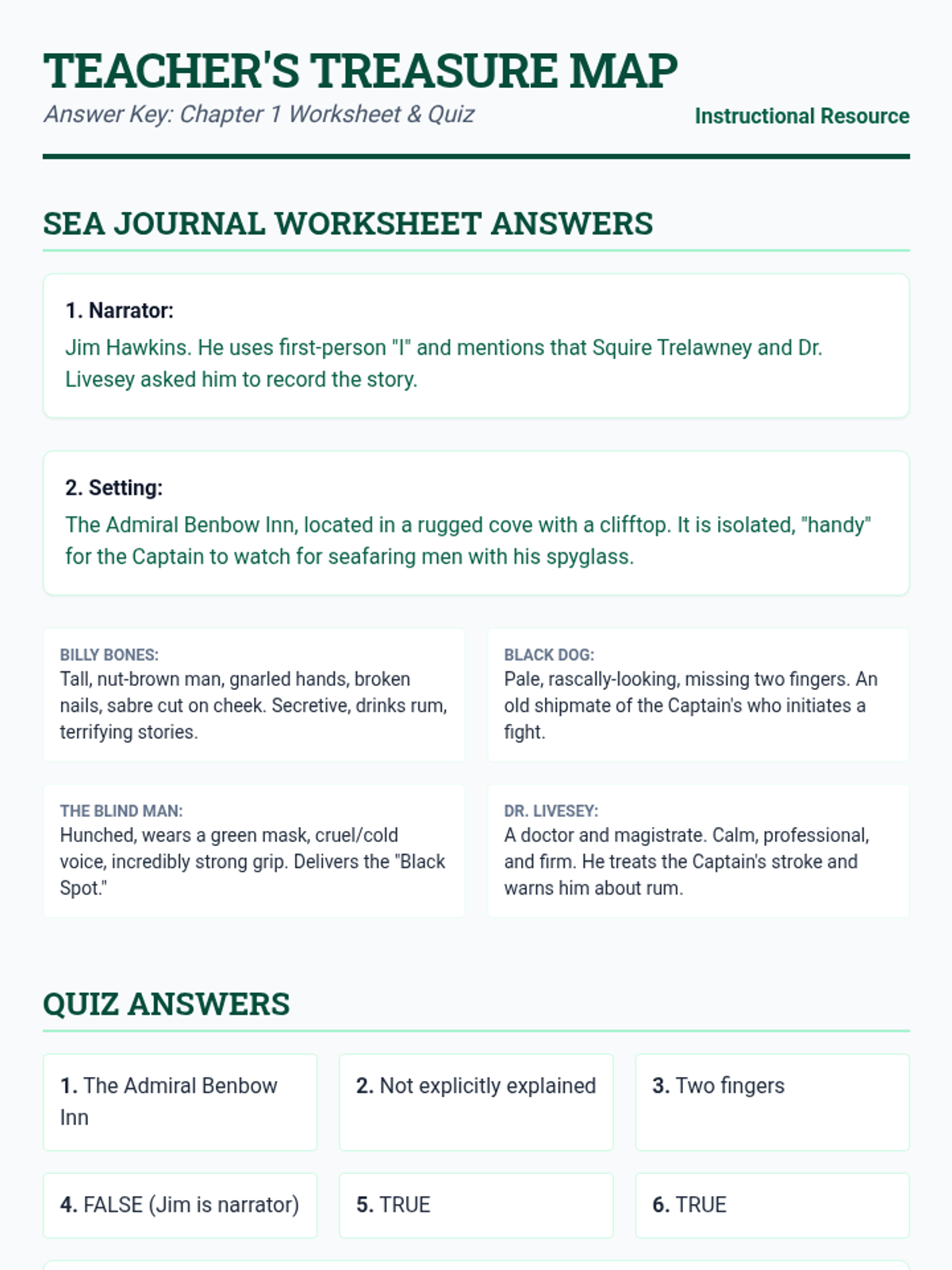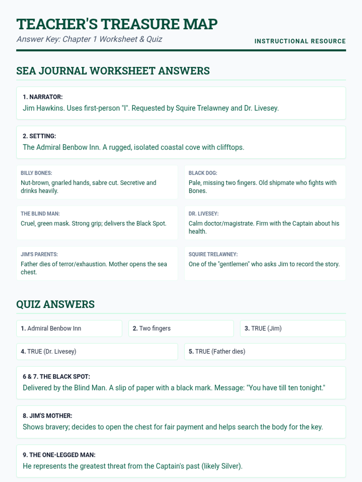 Revised teacher answer key with better text contrast, condensed layout to fit on a single page, and corrected character details based on the provided text.