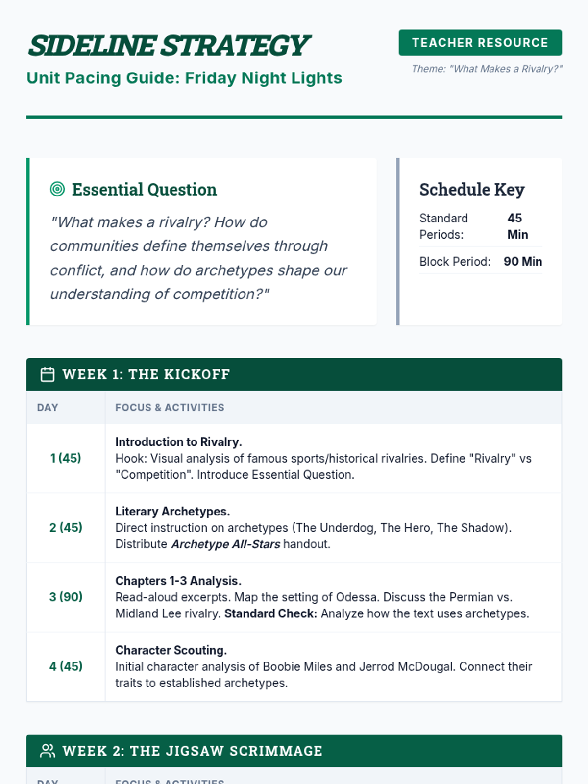 A comprehensive teacher-facing unit pacing guide for a 4-week exploration of Friday Night Lights, detailing daily activities for a mix of 45 and 90-minute class periods.