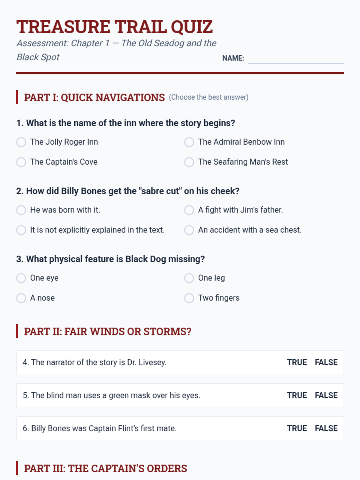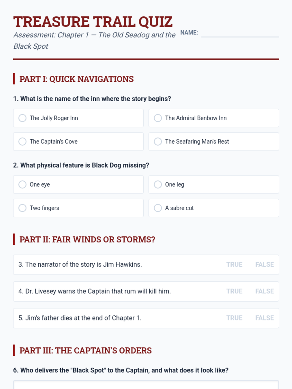 Revised quiz for Chapter 1 with expanded content covering more characters and plot points, ensuring consistent styling for answers and better page flow.