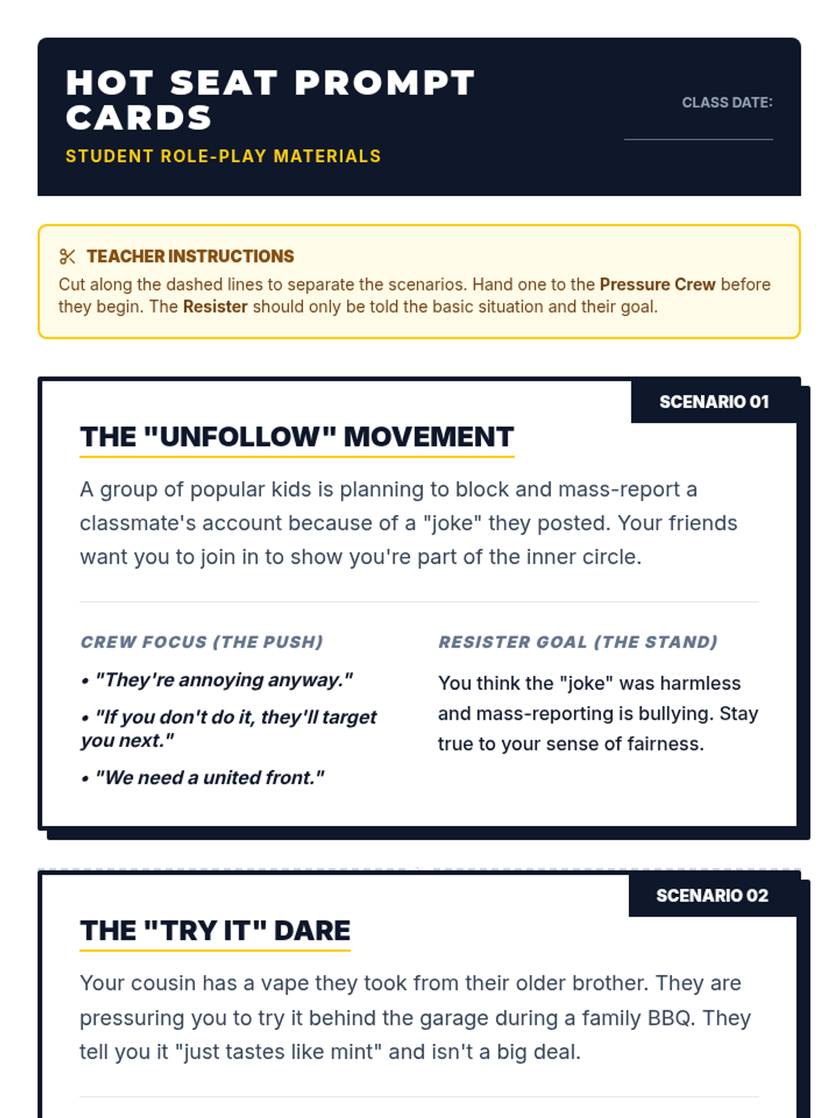 Printable scenario cards for students to use during "The Hot Seat" role-play, including "Hooks" and "Stakes" to intensify the social pressure, plus a reflection area for students to plan their refusal lines.