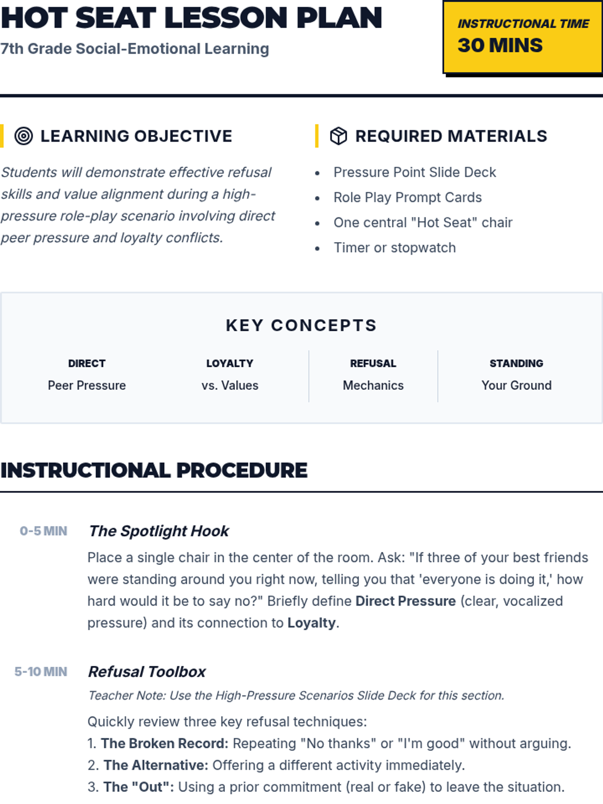 A comprehensive teacher's guide for the 'Hot Seat' role-play lesson, featuring timing, materials, specific refusal techniques, and facilitation prompts for handling high-pressure social scenarios.