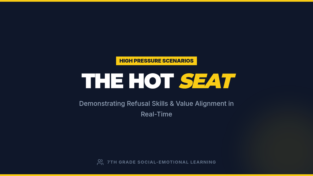 A high-impact slide deck for the 'Hot Seat' lesson, featuring visual guides for refusal skills, high-intensity role-play scenarios, and debrief prompts designed to keep 7th graders engaged.