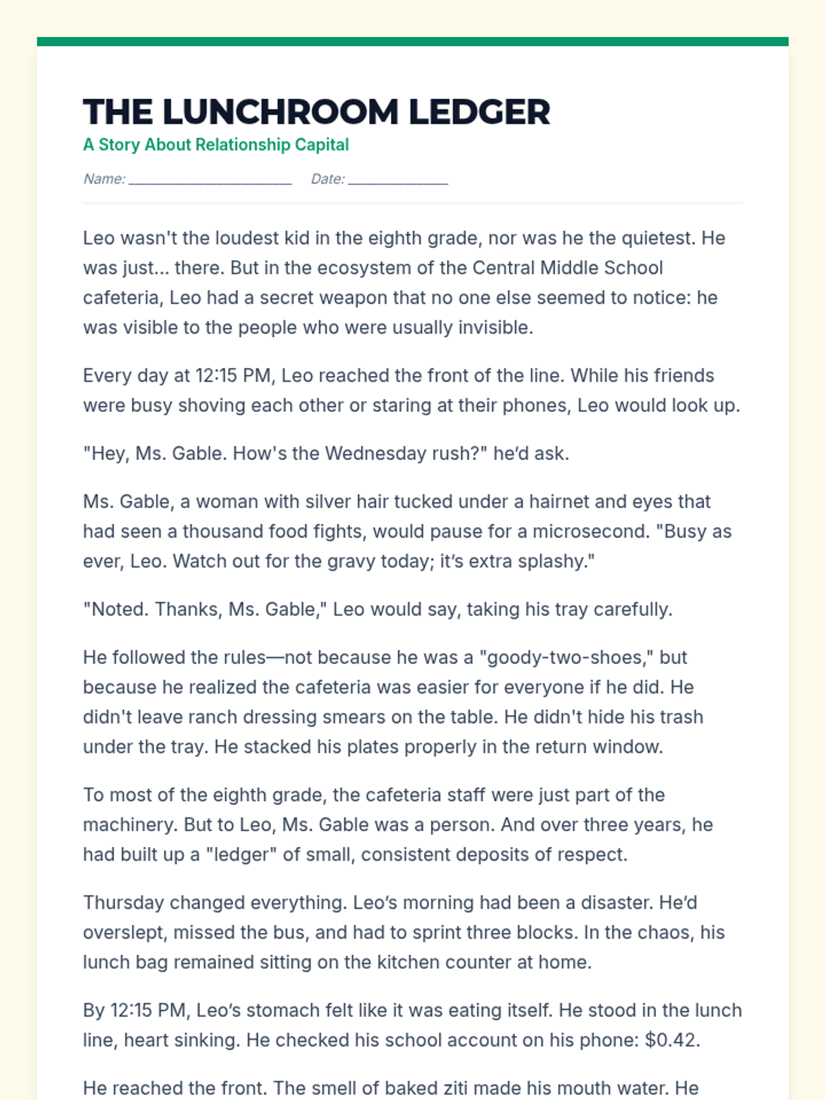 A story for 8th-grade students about Leo, a student who builds 'social currency' through small acts of kindness and rule-following in the cafeteria, which pays off when he forgets his lunch. Revised for better page flow and added reflection questions with student work areas.