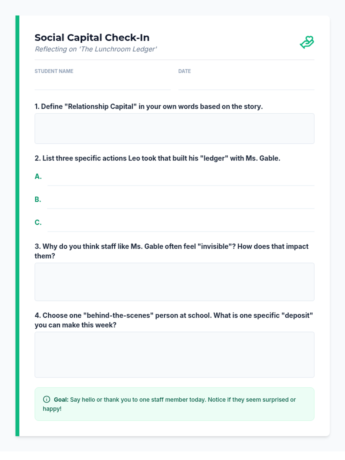 A reflection worksheet designed to help 8th-grade students analyze the concept of relationship capital. Revised for 1-page fit and improved writing space.